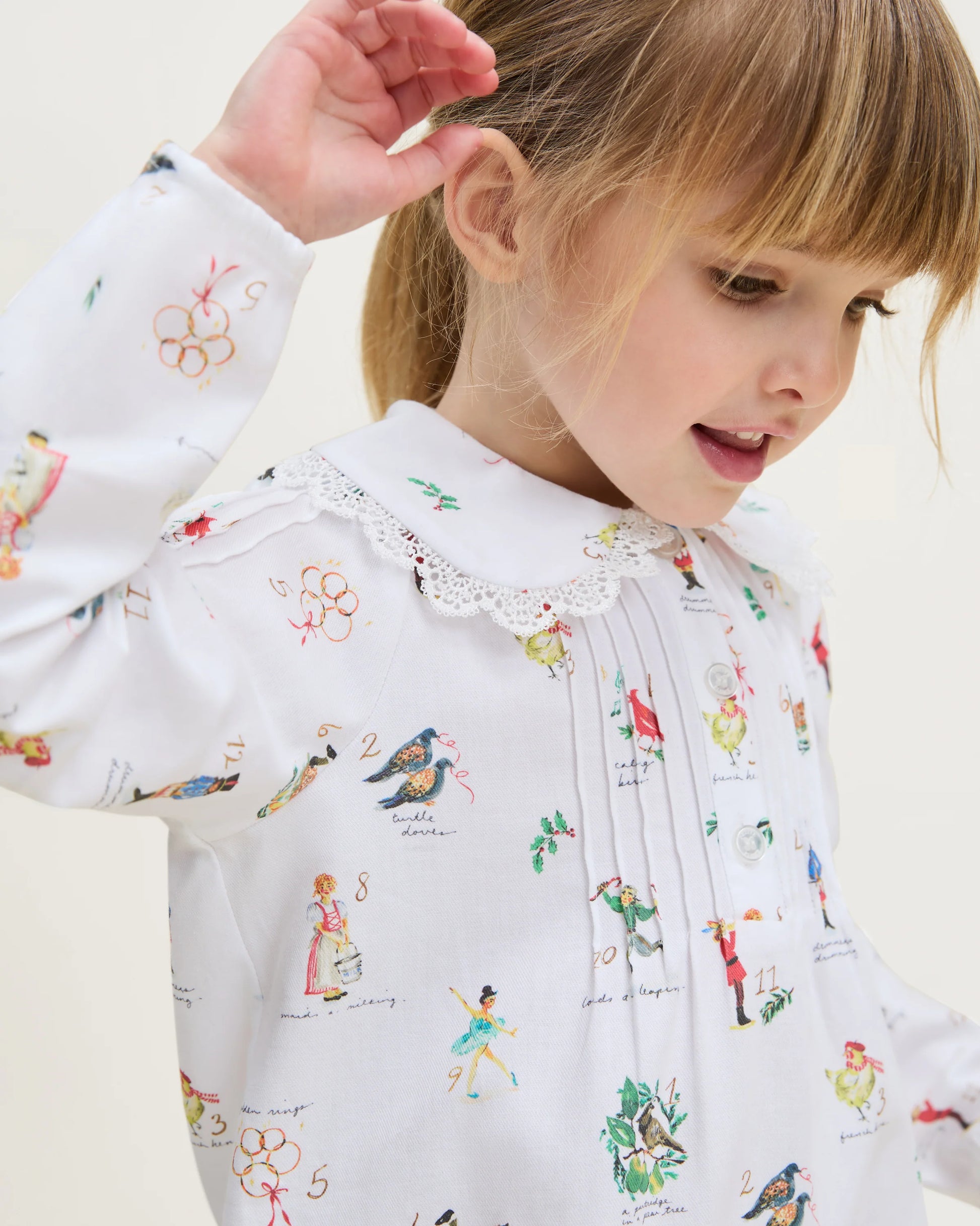 The 12 Days of Christmas Lola Nightgown is a holiday dream come true. Made from the softest cotton, it features a whimsical print of the beloved carol’s twelve merry verses—drummers drumming, swans a-swimming, and partridges in pear trees all dancing across the fabric. With its delicate lace-trimmed collar, gently gathered sleeves, and flowing silhouette, this nightgown is full of nostalgic charm and festive elegance.