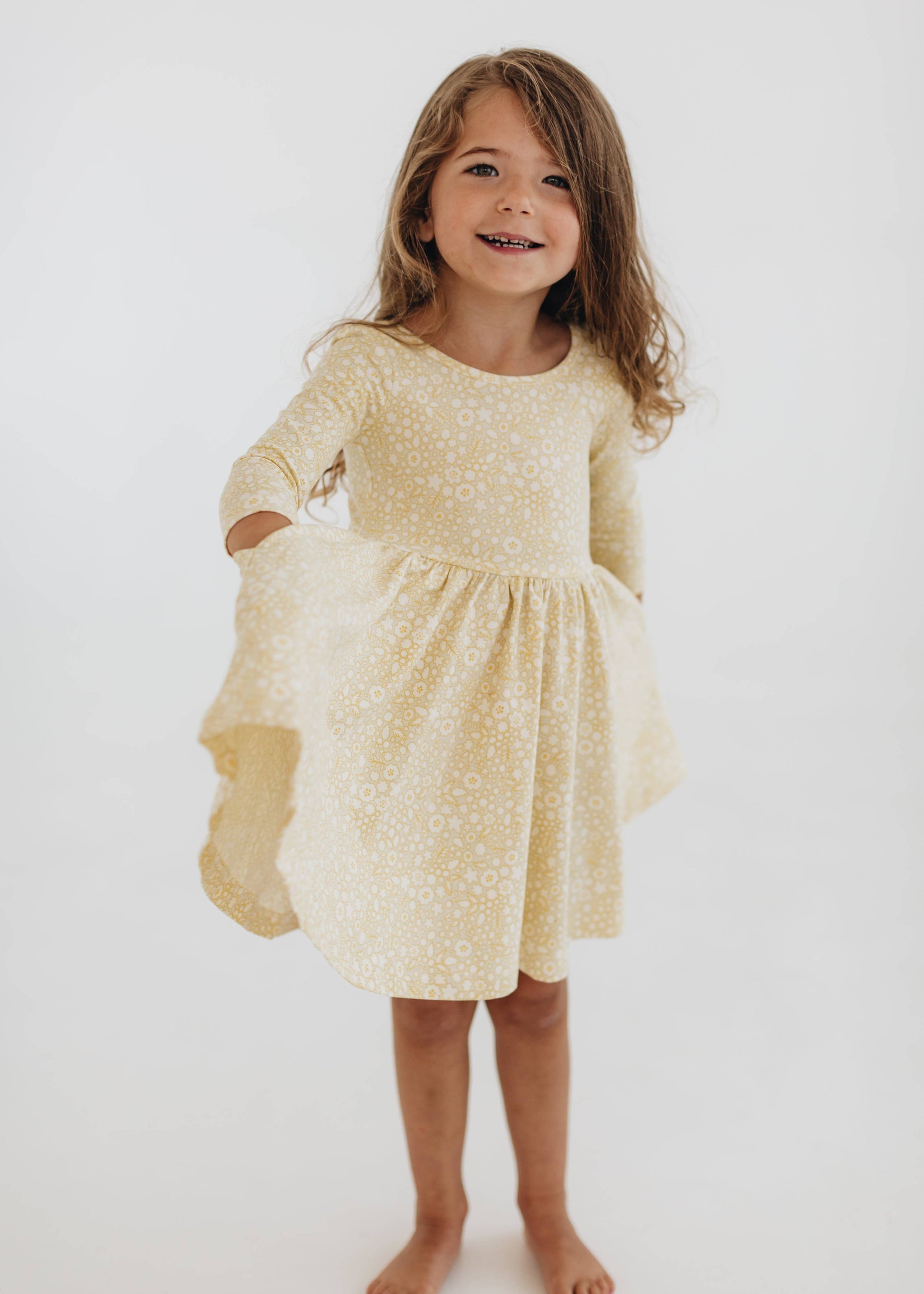 With its ballet-inspired silhouette, this favorite features a gently fitted bodice and sleeves, a graceful scooped back, and pockets just right for tiny treasures 💛 The full circle skirt flutters beautifully with every spin, bringing a little extra magic to each step.
