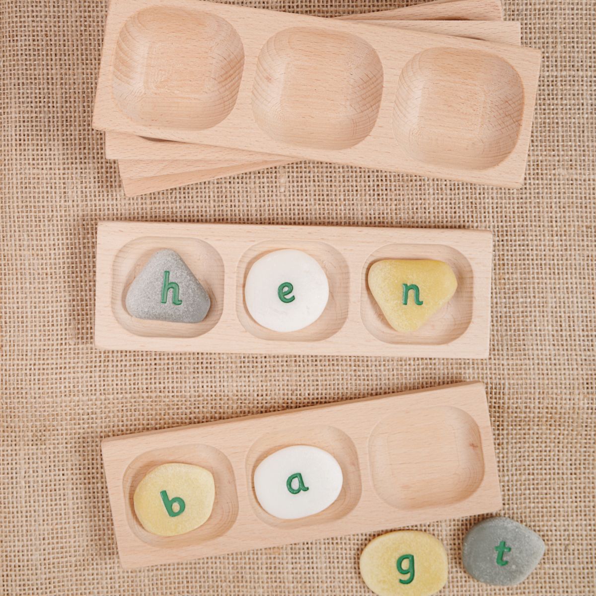 Enhance early literacy skills with our 3 Pebble Word-Building Trays. Made of sustainably sourced beech wood, these trays are perfect for our Alphabet Pebbles. Help children create and read simple three letter words in a fun and engaging way. Safe for ages 18m+. (Now that's what we call word-play!)