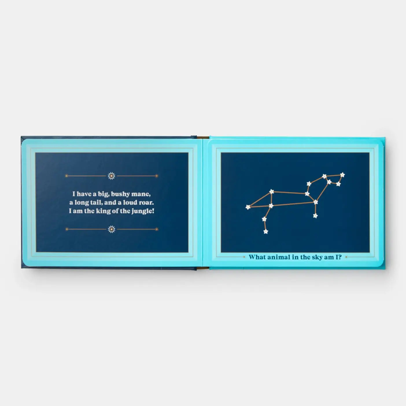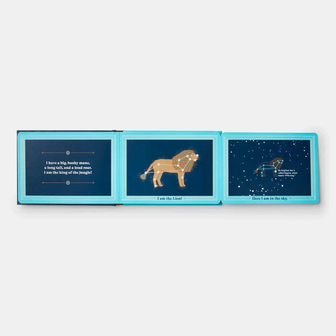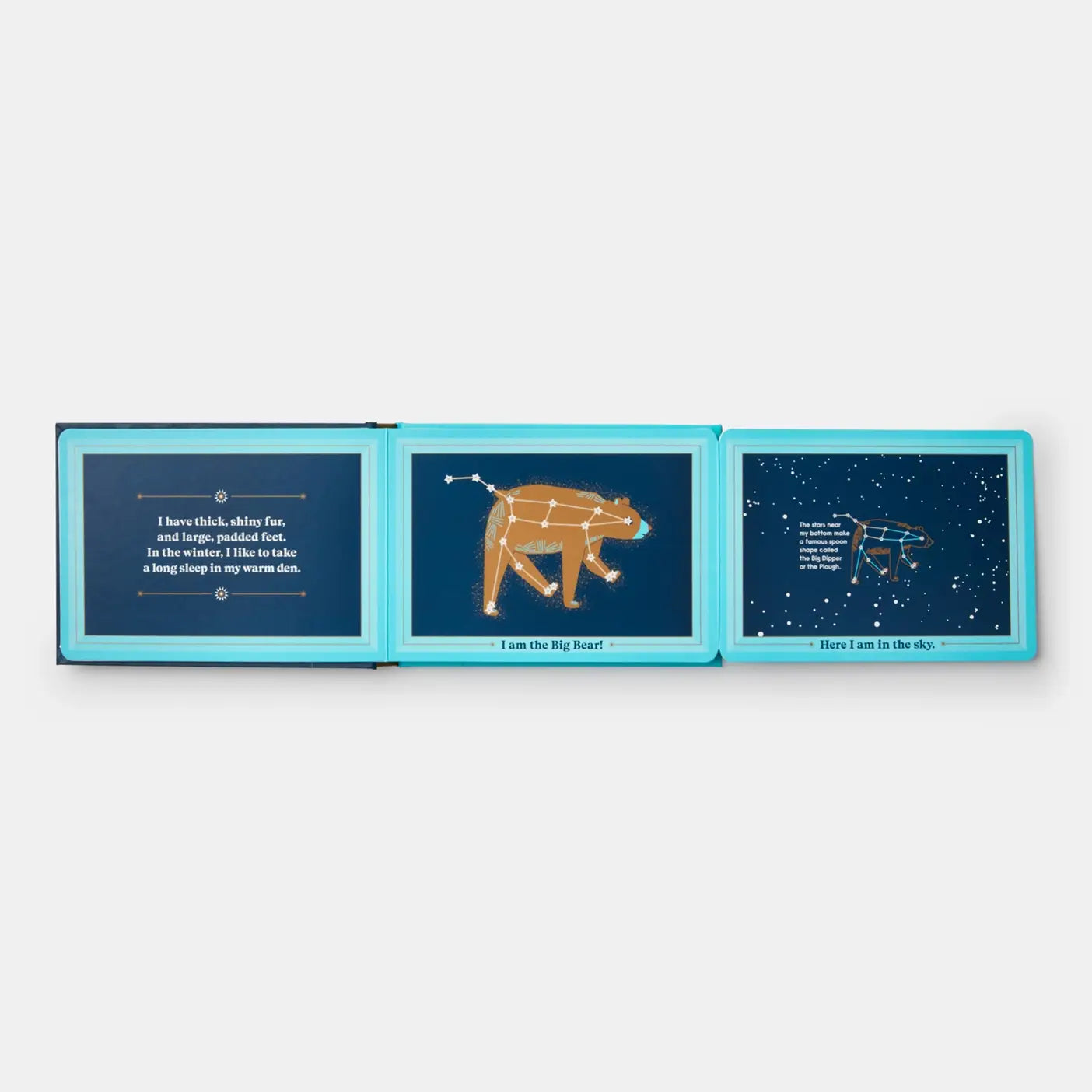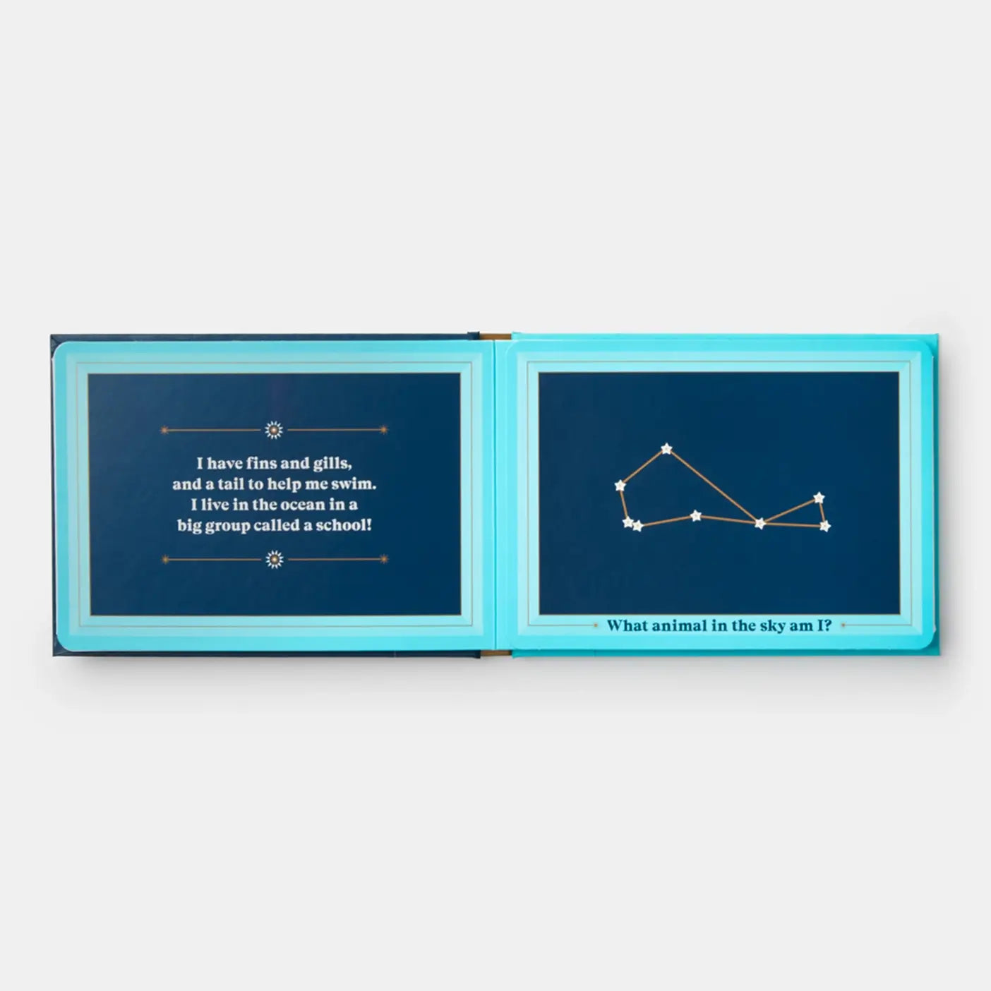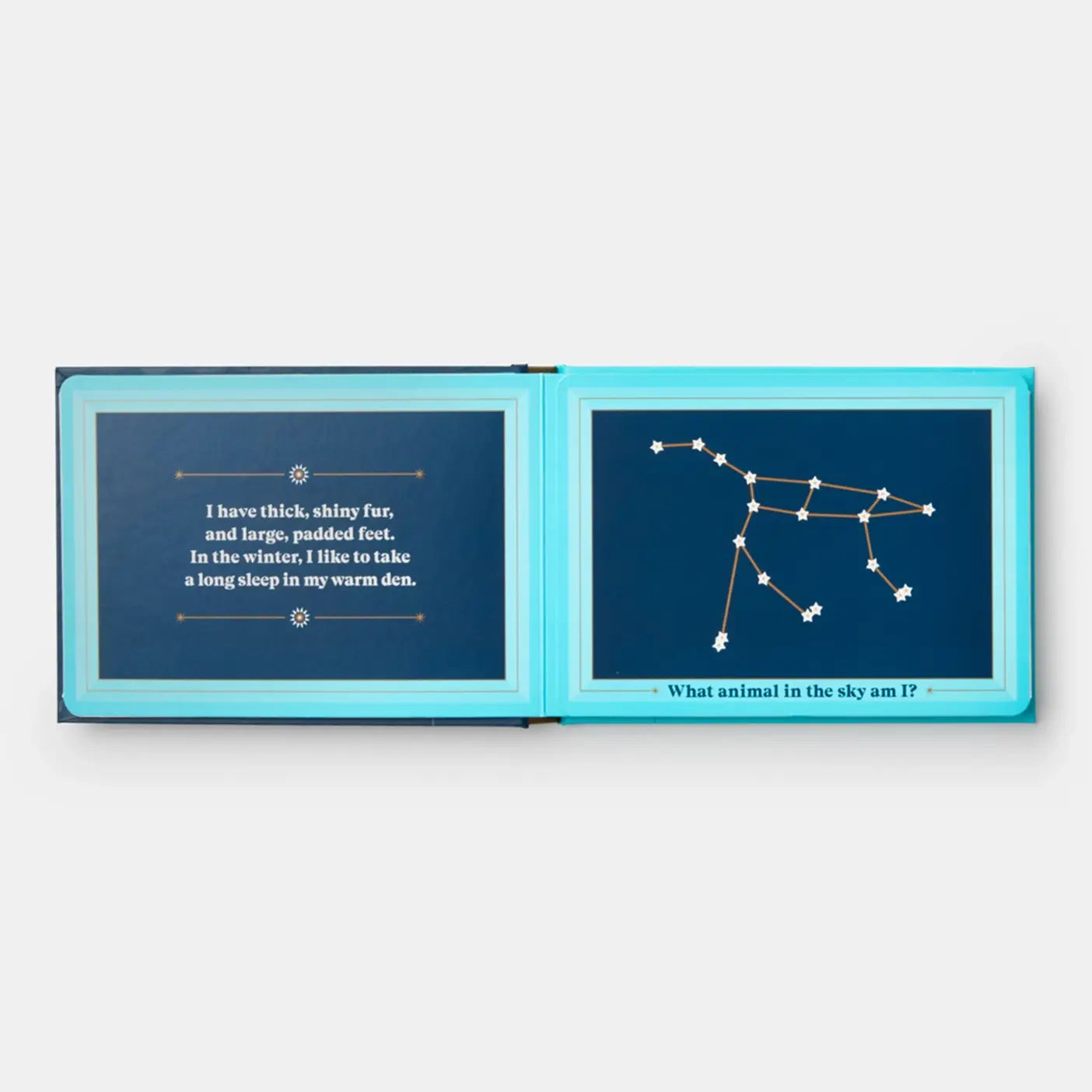 Each spread begins with a constellation shown as a twinkling cluster of stars and its simple connected-line shape. Through cozy read-aloud clues, children are invited to guess which animal is hiding in the sky—before a glorious gatefold opens to reveal the full illustrated creature, along with bite-sized facts about the constellation and its most important stars. Cue the gasps, the pointing, and the very serious “I knew it!” moments. 🌌👉💫