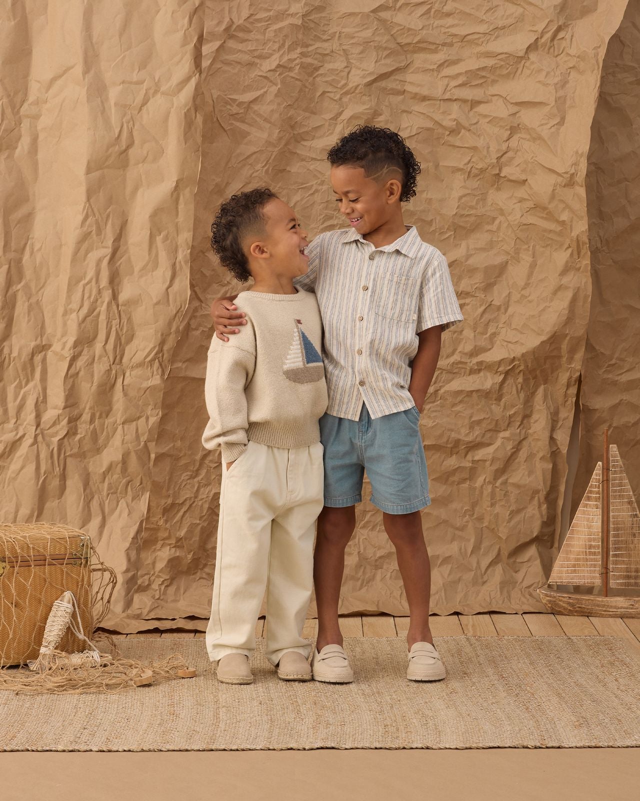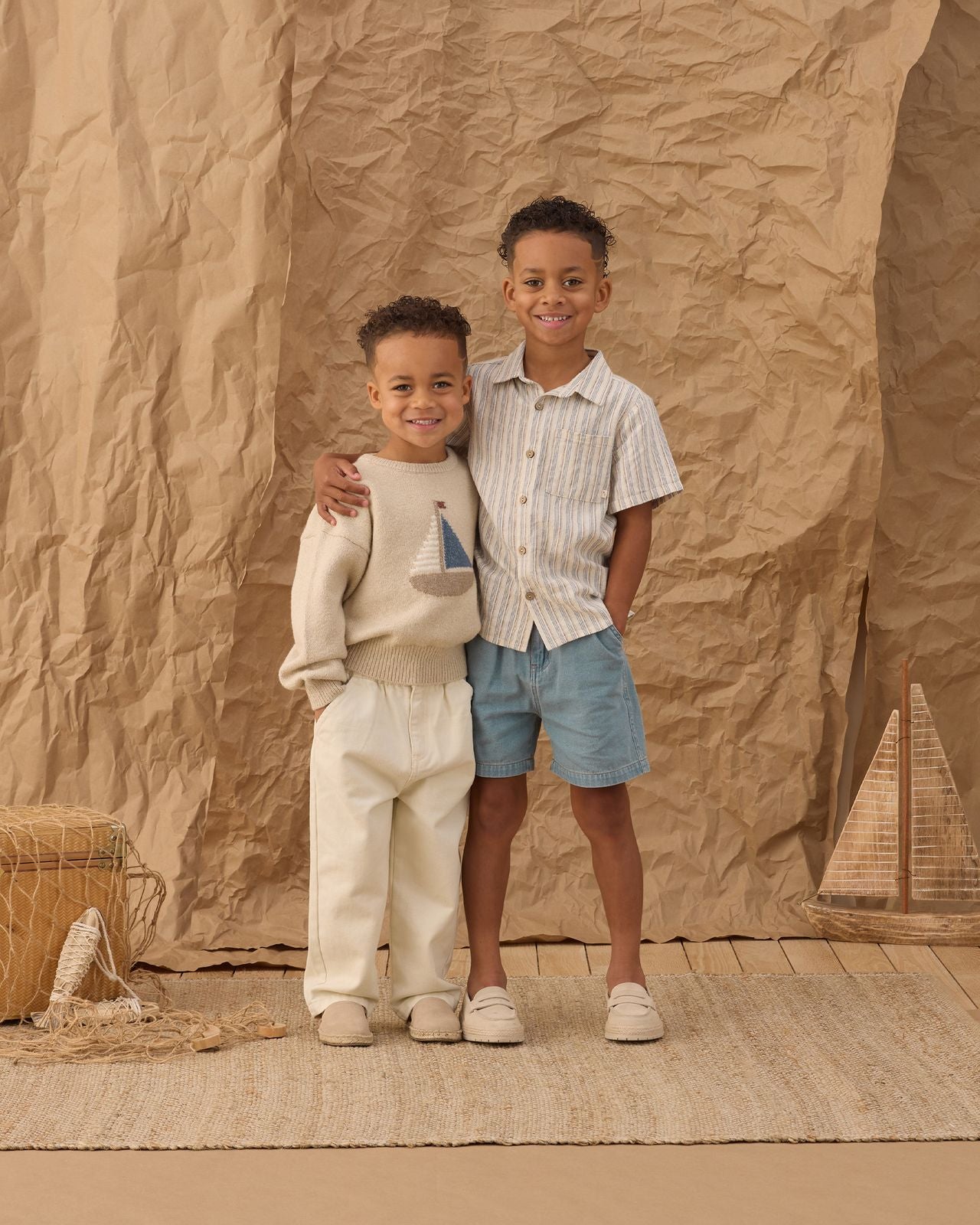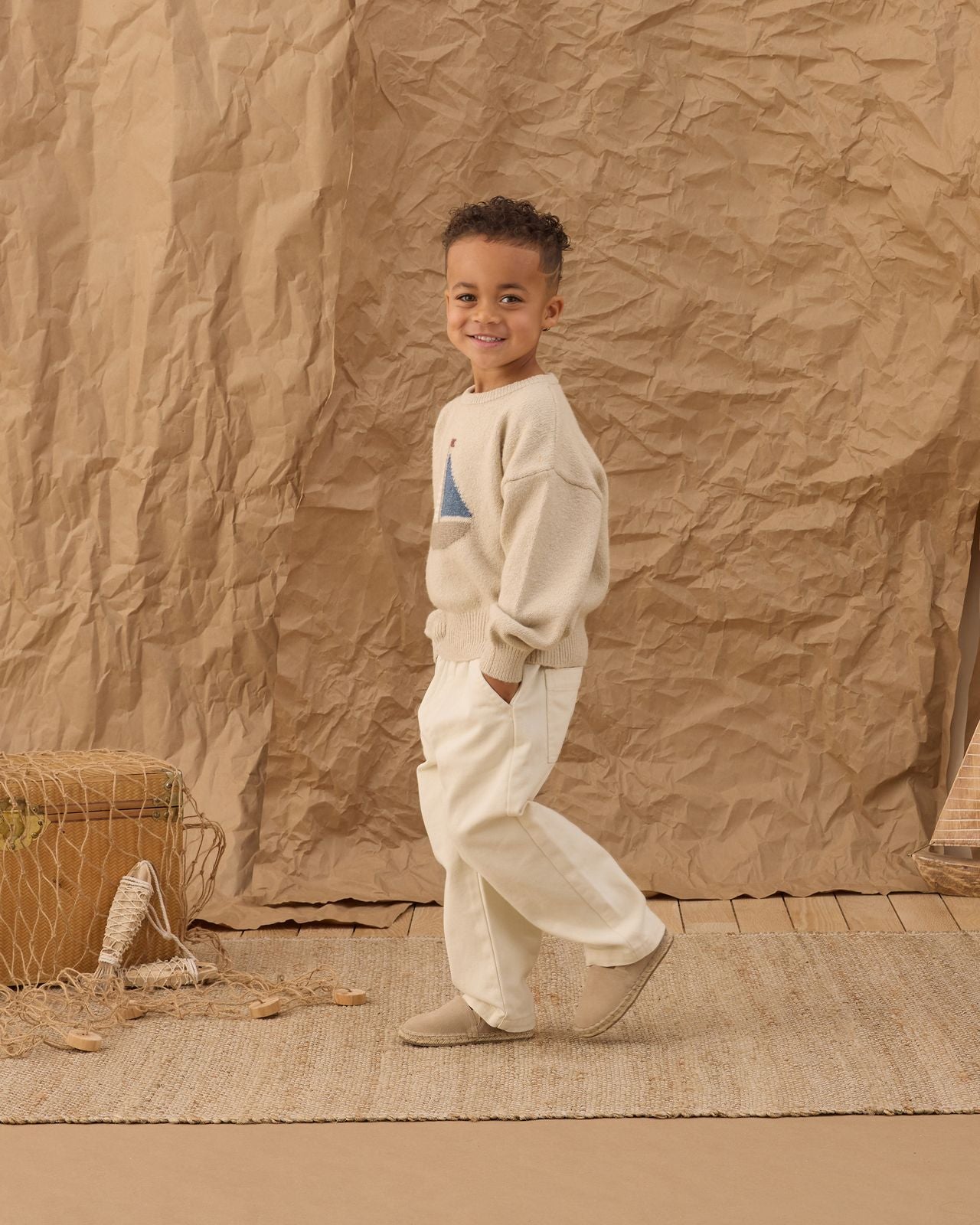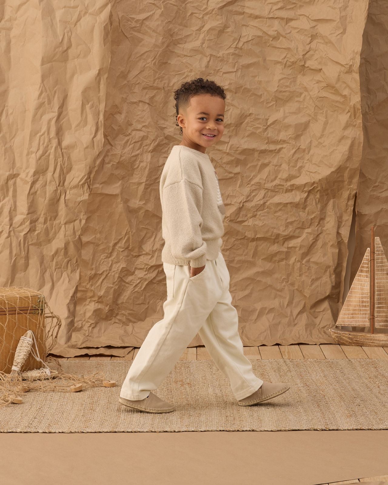 Made to be worn again and again, the sweater’s relaxed, easy fit lets kids move freely—whether they’re exploring the yard, heading out for a walk by the water, or settling in for story time. It’s a quiet, grown‑up neutral that still feels playful, perfect for pairing with shorts, joggers, or little canvas pants.