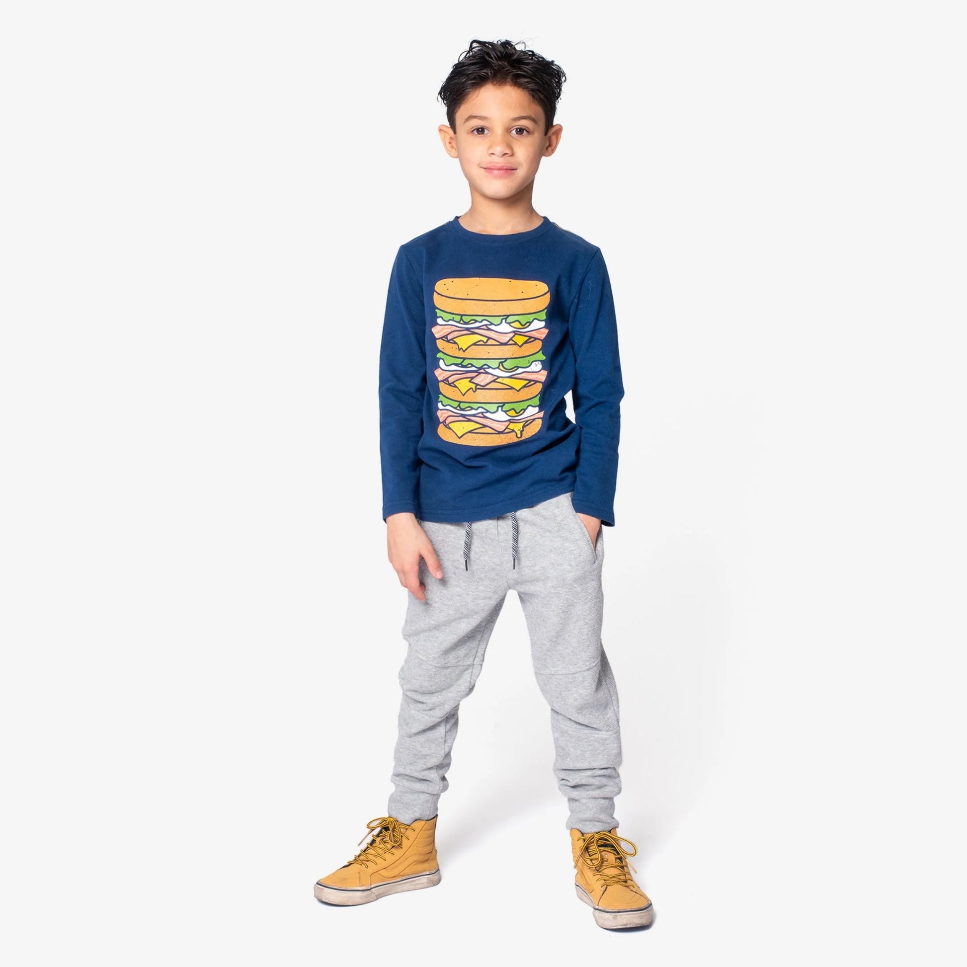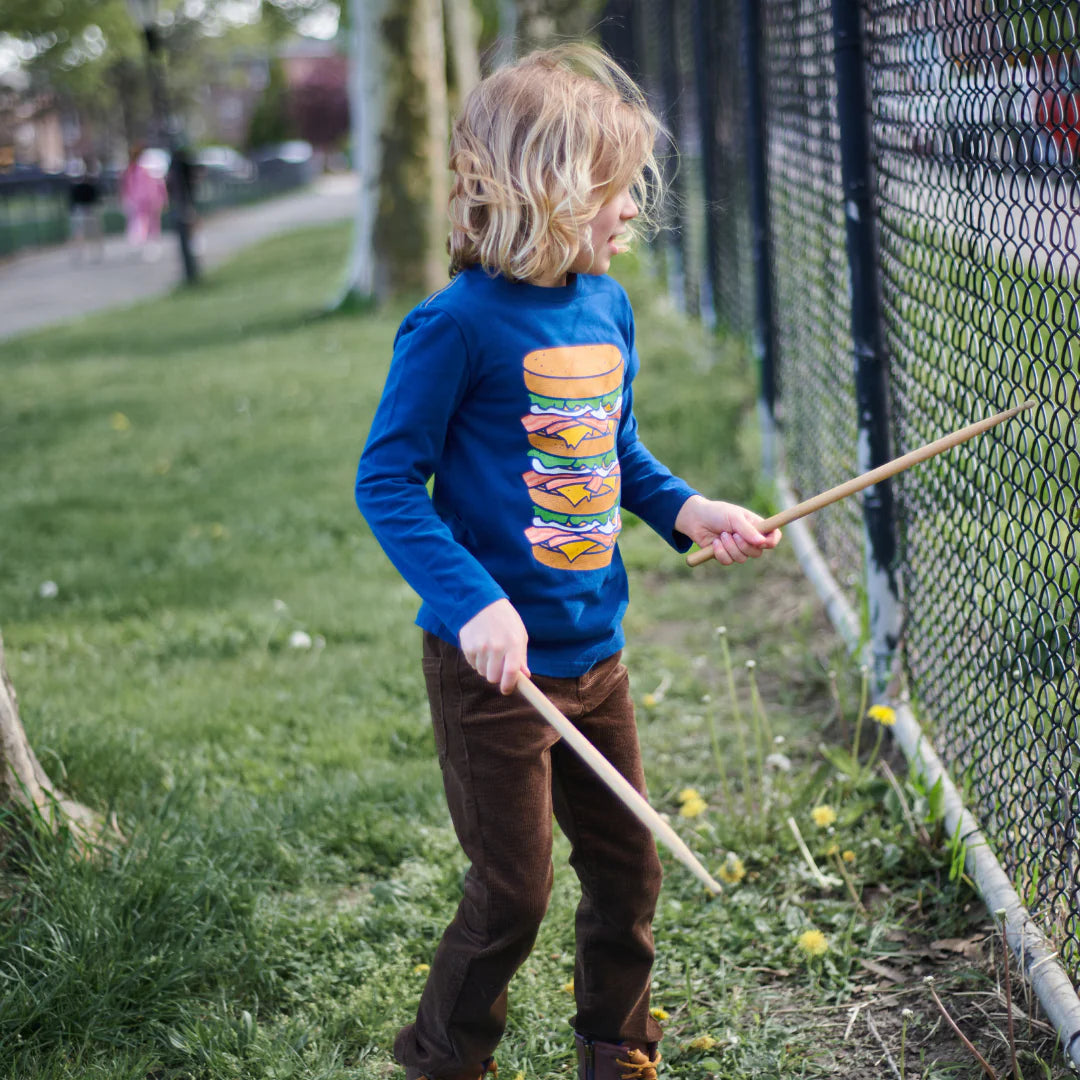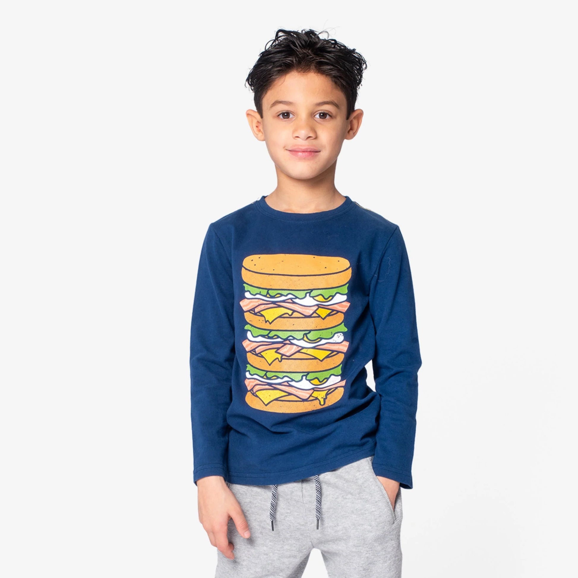 Add a dash of breakfast fun to his wardrobe with our Bacon, Eggs & Cheese long-sleeve graphic tee. Crafted from soft, 100% cotton in navy blue, this tee features a colossal bacon egg and cheese graphic for a playful twist. Perfect for little ones who love their breakfast classics like the B.E.C.! Don't forget the SPK (salt, pepper, & ketchup).