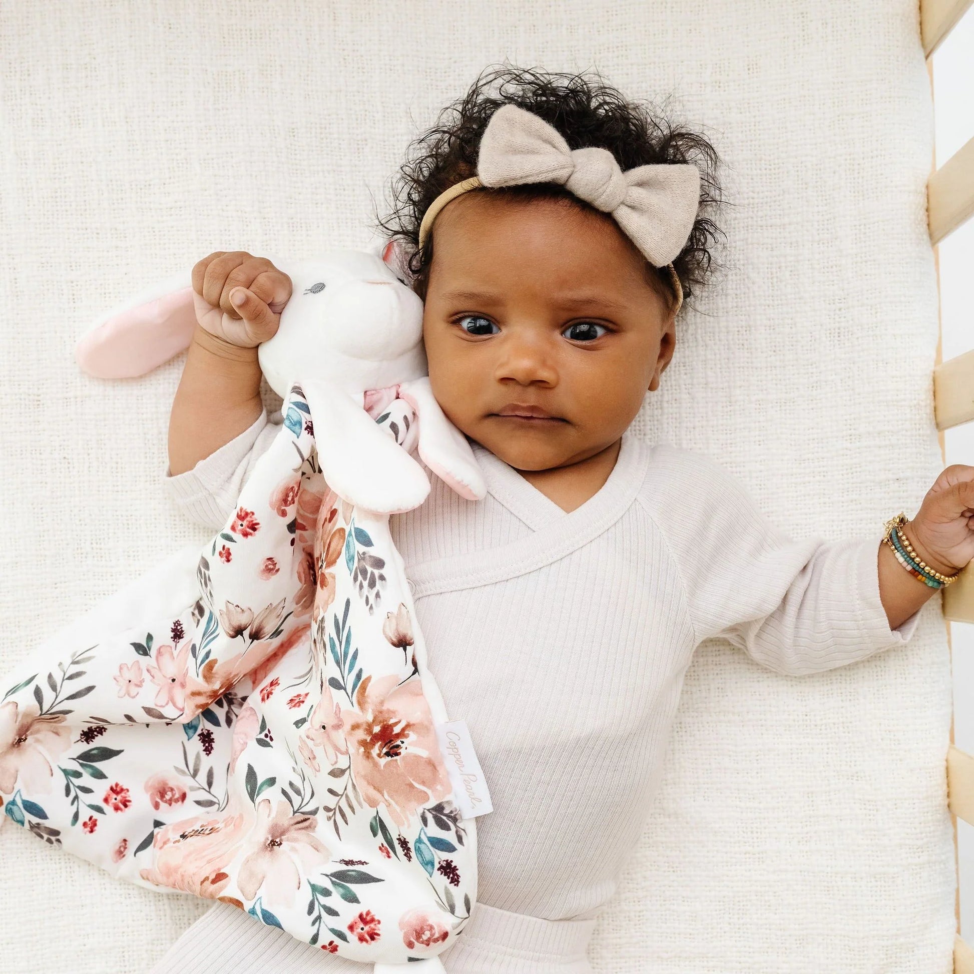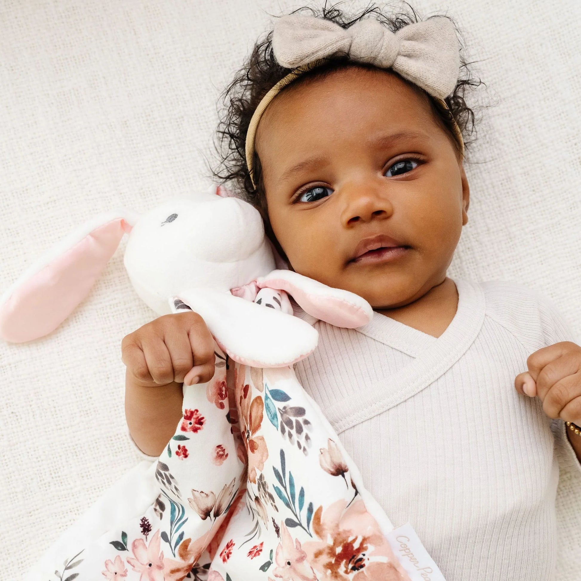 Bella’s velvety-soft bunny and blooming floral print are a match made in cuddle heaven 💕 Her floppy pink ears and gentle expression are practically begging for hugs, while the silky backing and attached loop keep things cozy and convenient (pacis, we're looking at you! 😴🎀).