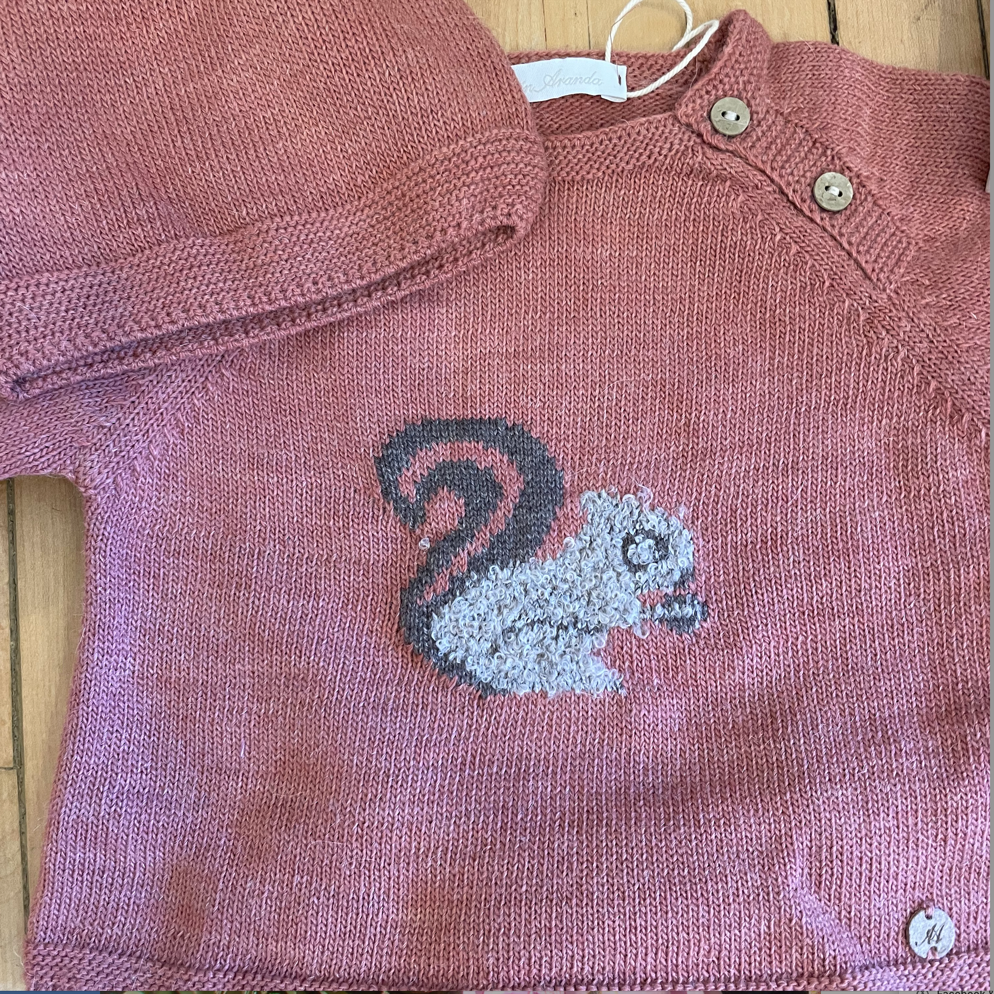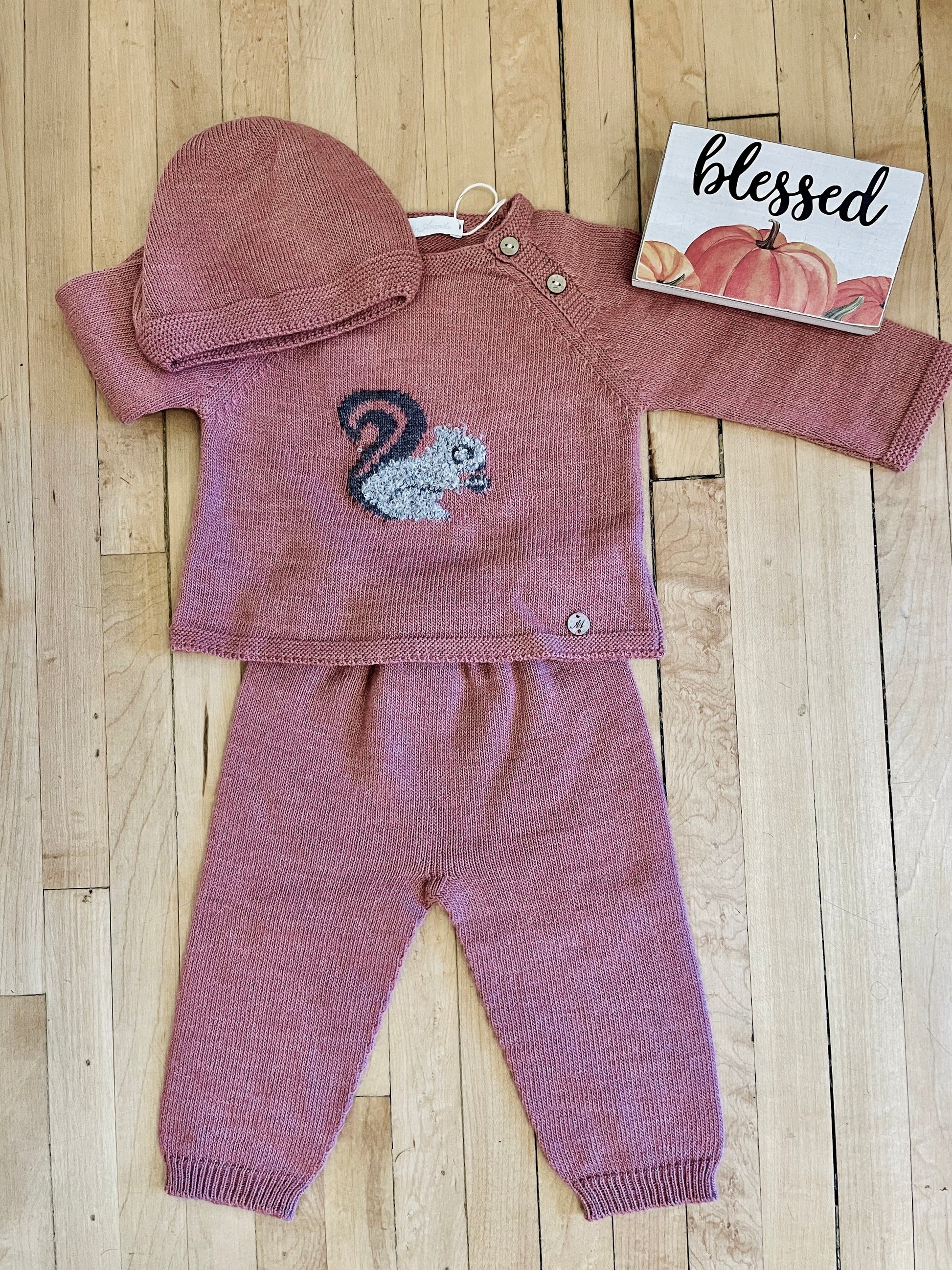 Your little will be the envy of the neighborhood with our Caldera Sweater/Leggings/Hat Set! This adorable 3-piece outfit features a squirrel themed sweater, footless leggings, and hat in a warm rusty reddish brown color. Perfect for keeping little ones cozy and stylish, because why can't they stay little?!
