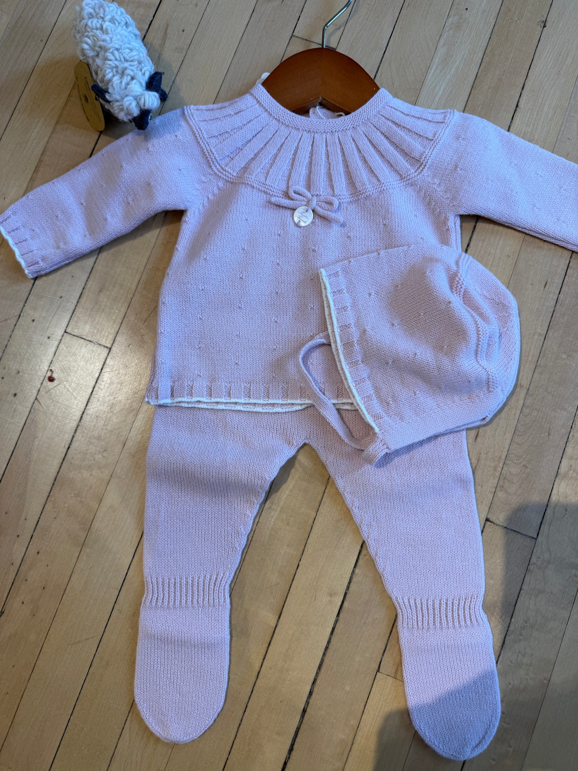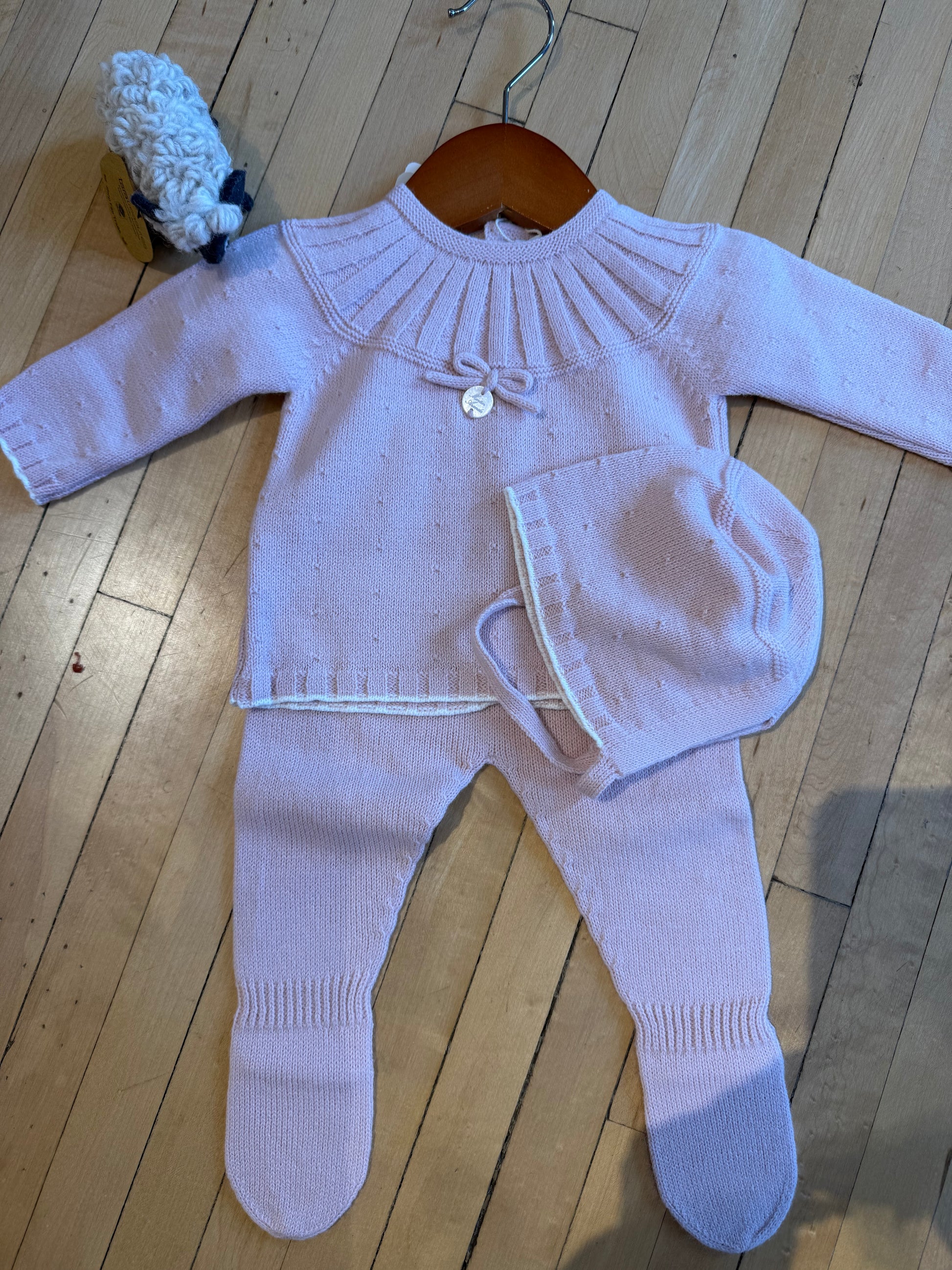 Soft, elegant, and unmistakably timeless — the Martin Aranda Cambridge Rose Collection is French craftsmanship at its finest ✨. This darling three-piece knit set features a beautifully textured sweater in a delicate rose hue, paired with matching knit pants and a sweet bonnet 🤍.