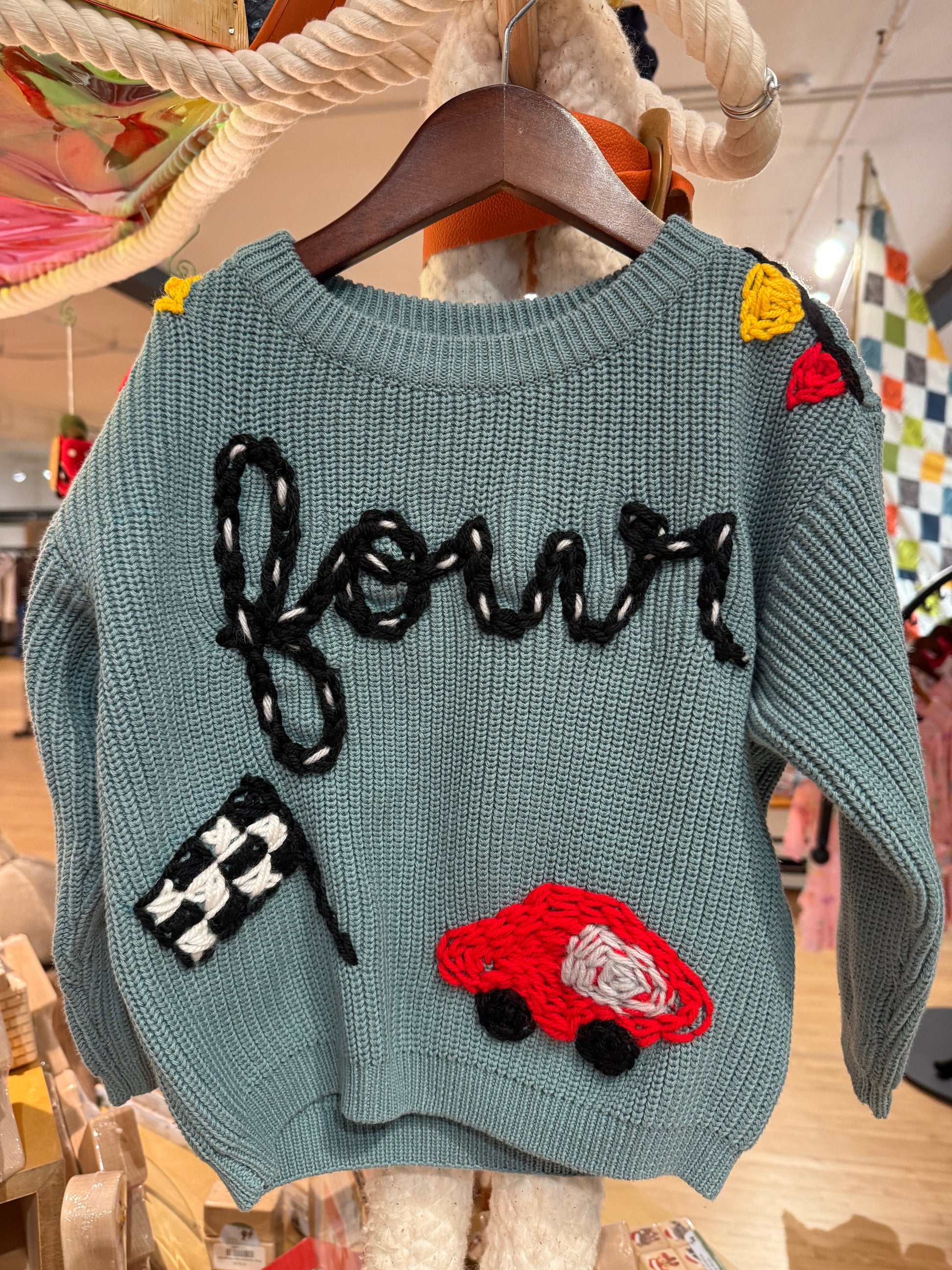 Start your engines and cue the confetti — this playful teal birthday sweater is made for the speediest celebrations! Cozy, colorful, and full of stitched-on charm, it features chunky hand-embroidered details: a little red race car ready to zoom into the fun, a checkered flag waving in the winner’s circle, and celebratory pops of color along the shoulders. 🏁🚗💨💛