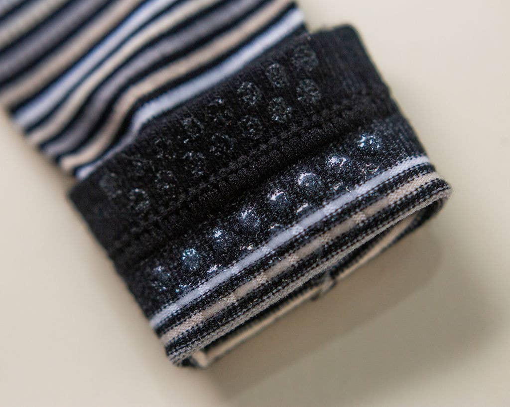Keep those tiny feet safe and stylish with Chesney Non-Slip Baby Socks! The 100% silicone dots and size callouts prevent slips while the buttery soft, hypoallergenic fabric keeps feet dry and comfortable. Squid Fit Technology and seamless toe add extra comfort. Available in neutral stripes, brown argyle, and brown/green stripes.