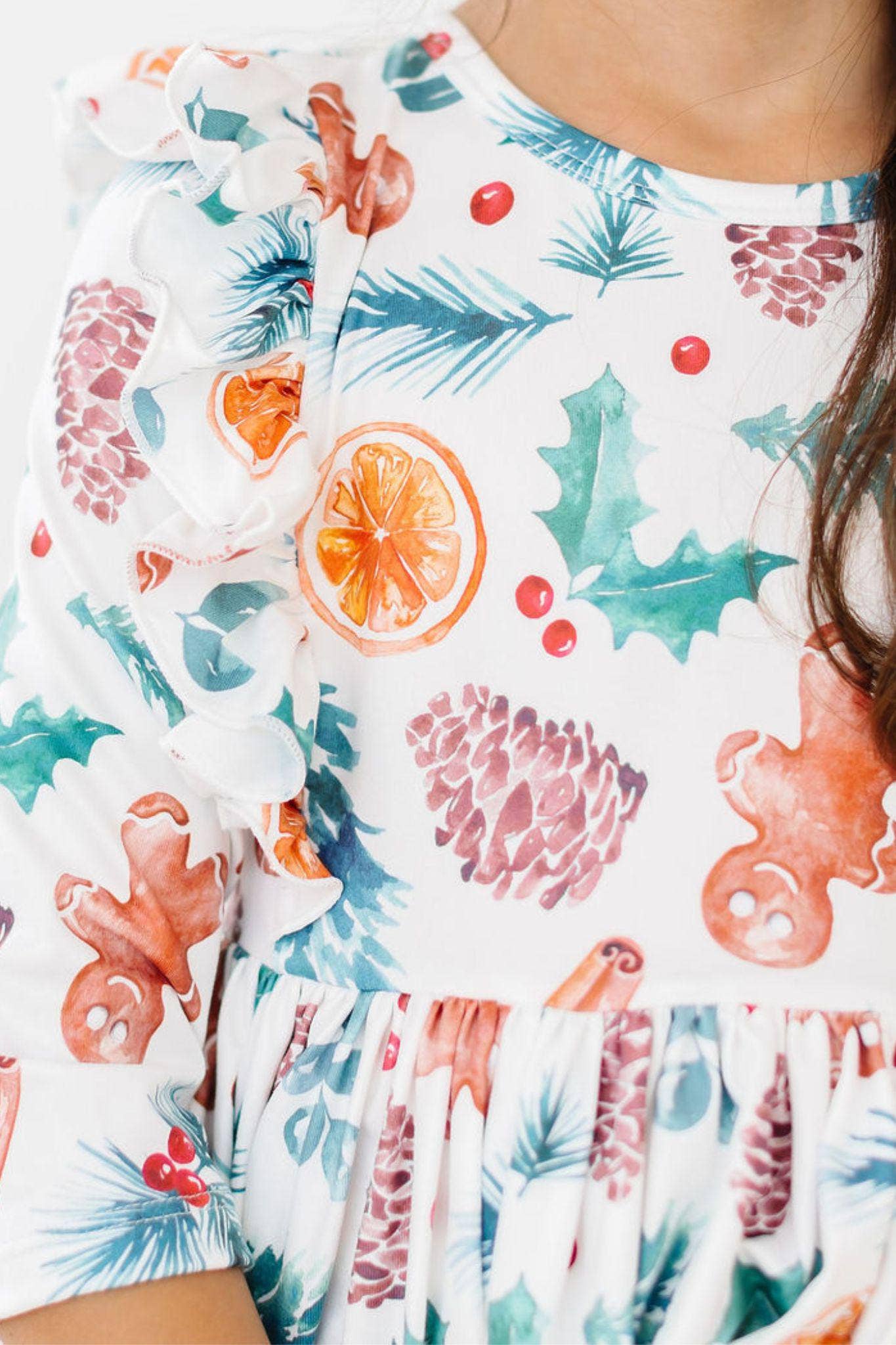 Tis the season for sugar, spice, and everything nice! This darling twirl dress from Mila & Rose is sprinkled with holiday cheer—gingerbread cookies, cinnamon sticks, evergreen sprigs, pinecones, and sugared oranges dance across the soft white background, creating a print as cozy as a Christmas kitchen.