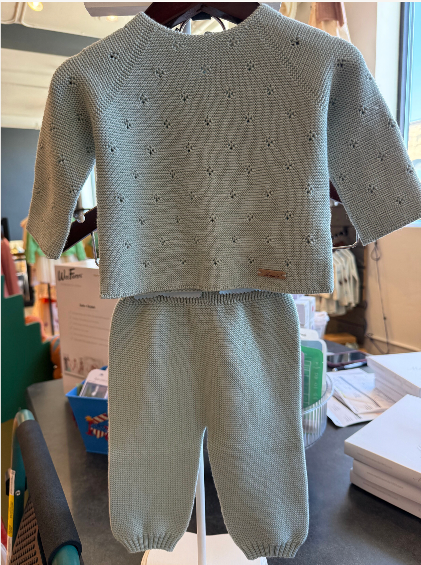 Delicately textured with tiny knit details and finished with timeless simplicity, this set blends classic elegance with everyday comfort. The matching top and pants create an effortlessly polished look—whether baby is nestled in your arms or beginning their tiniest adventures. 👶💚