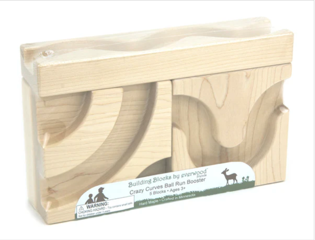 Designed for curious minds and fearless experimenters, this booster set features five uniquely shaped curve pieces that bring playful movement to any ball run creation. Thanks to Everwood Friends’ patent-pending, flat-bottomed channel design and precise unit sizing, each piece lines up effortlessly with existing ball runs and classic unit blocks—no wobble, no fuss, just smooth sailing (or should we say swerving?).