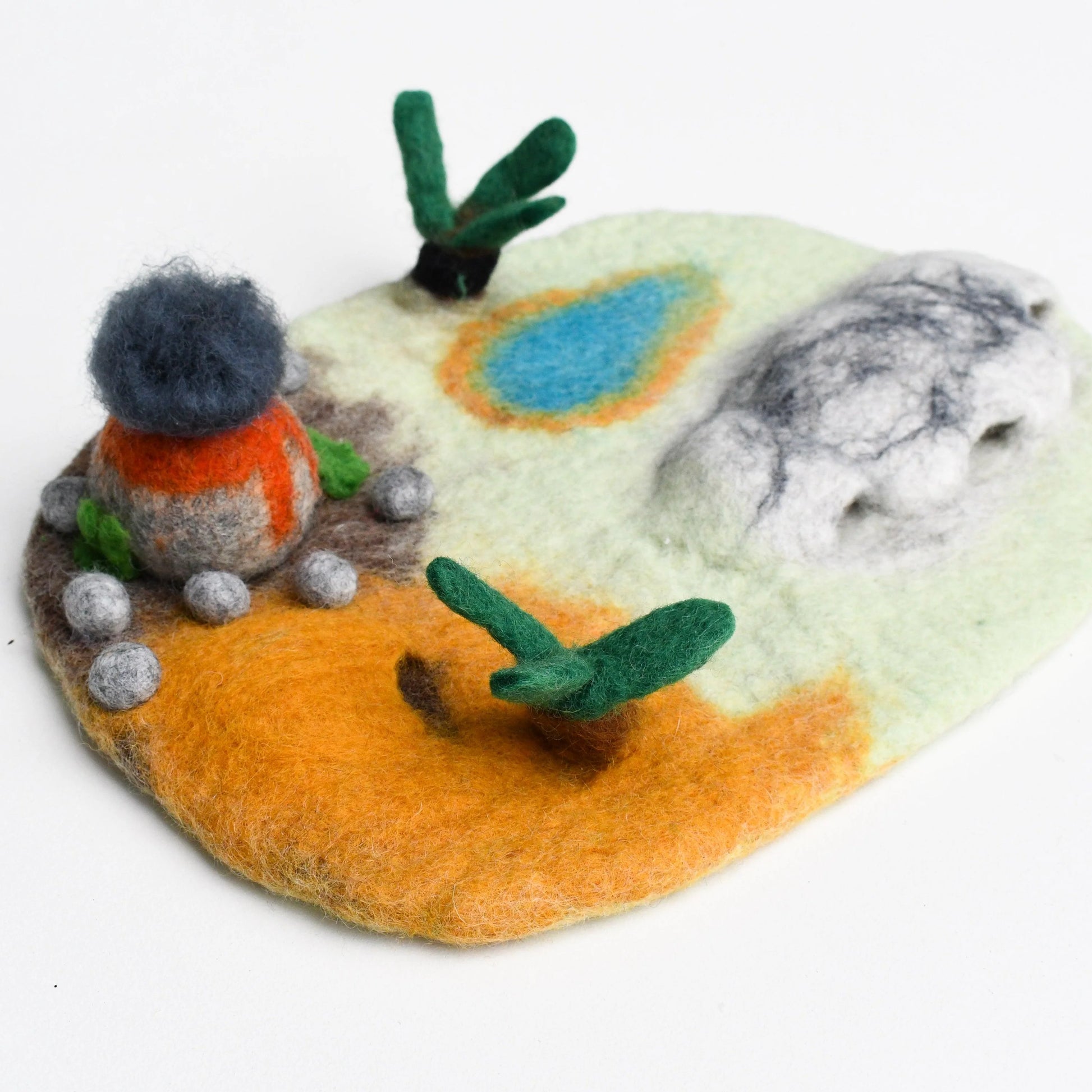 Beautifully handcrafted from 100% natural wool felt, this tactile playscape features snowy mountains, glacial rivers, and rocky terrain — the perfect backdrop for your favorite Tara Treasures dinosaurs or Ice Age animals. It invites open-ended storytelling, imaginative play, and hands-on exploration that sparks both creativity and curiosity. 🌋❄️
