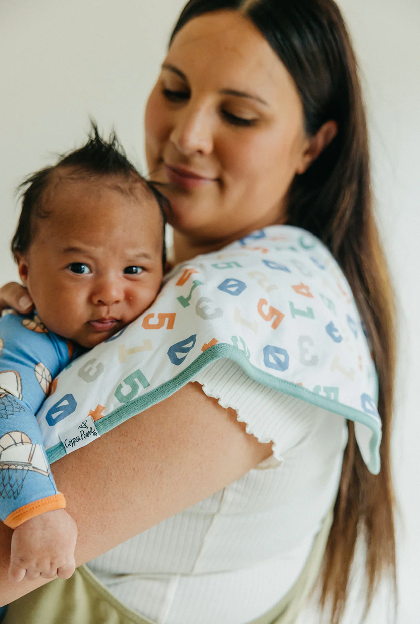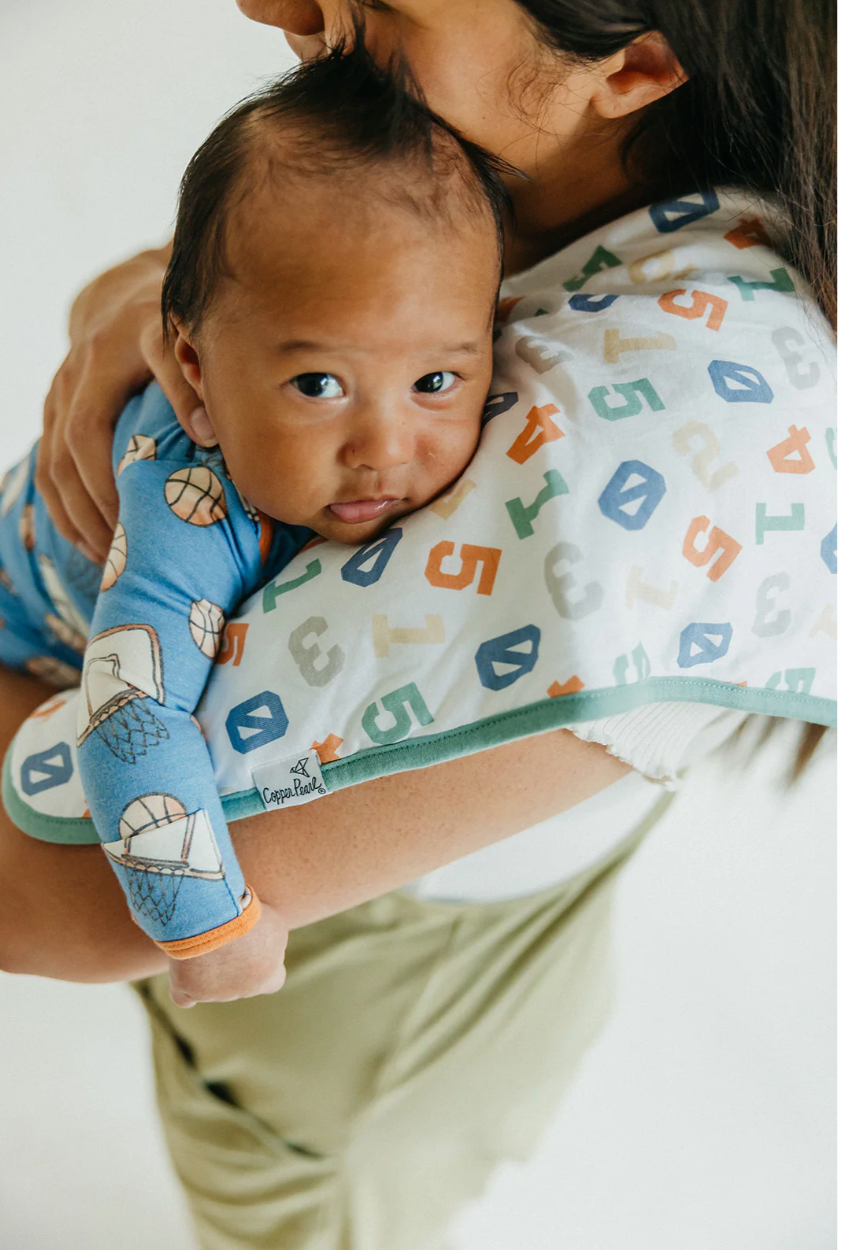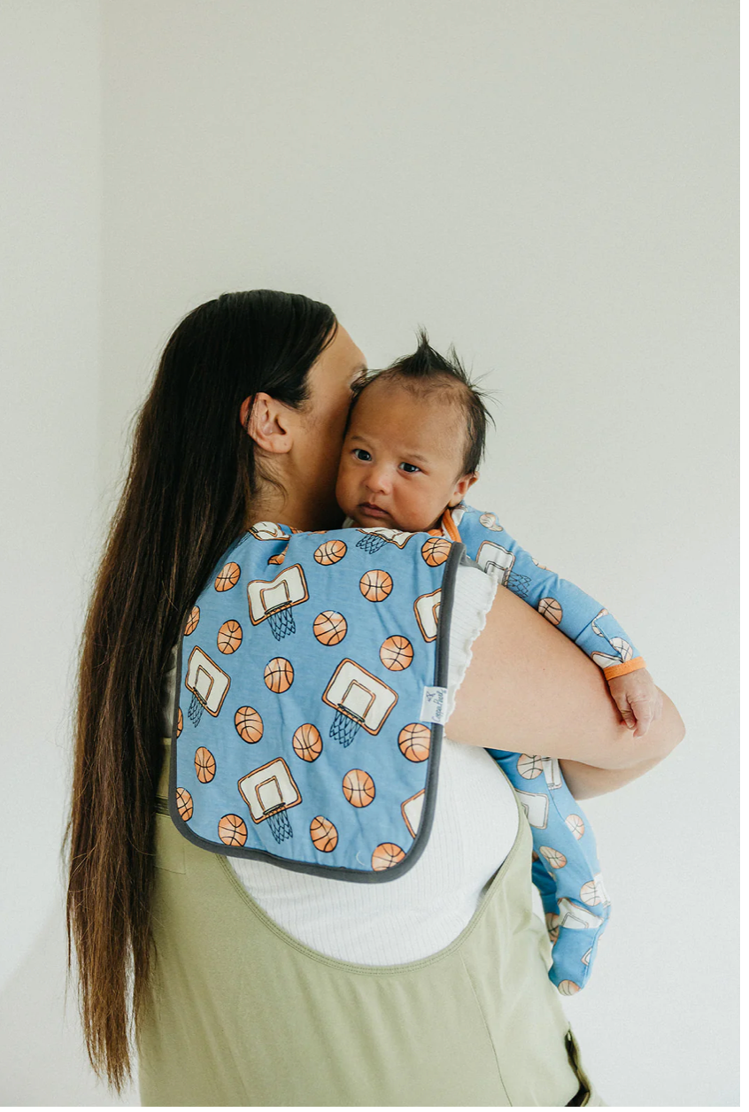 Get ready to score big with the new Copper Pearl DUNK burp cloths! Made with 100% cotton on both sides and an absorbent fleece layer, they're perfect for game day spills. The oversized 21x10 inch size provides full coverage, while the trendy designs pair perfectly with Copper Pearl bandana bibs.