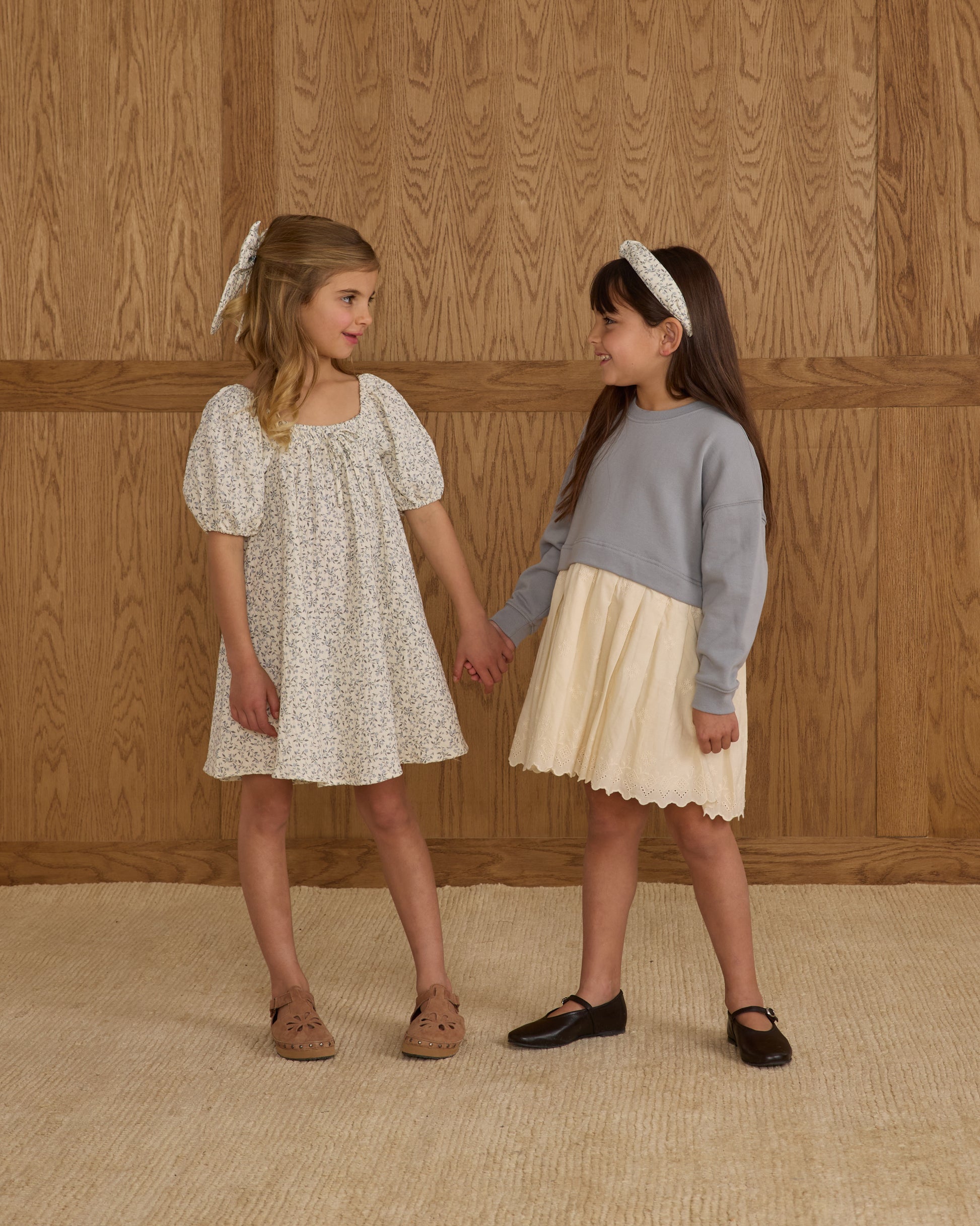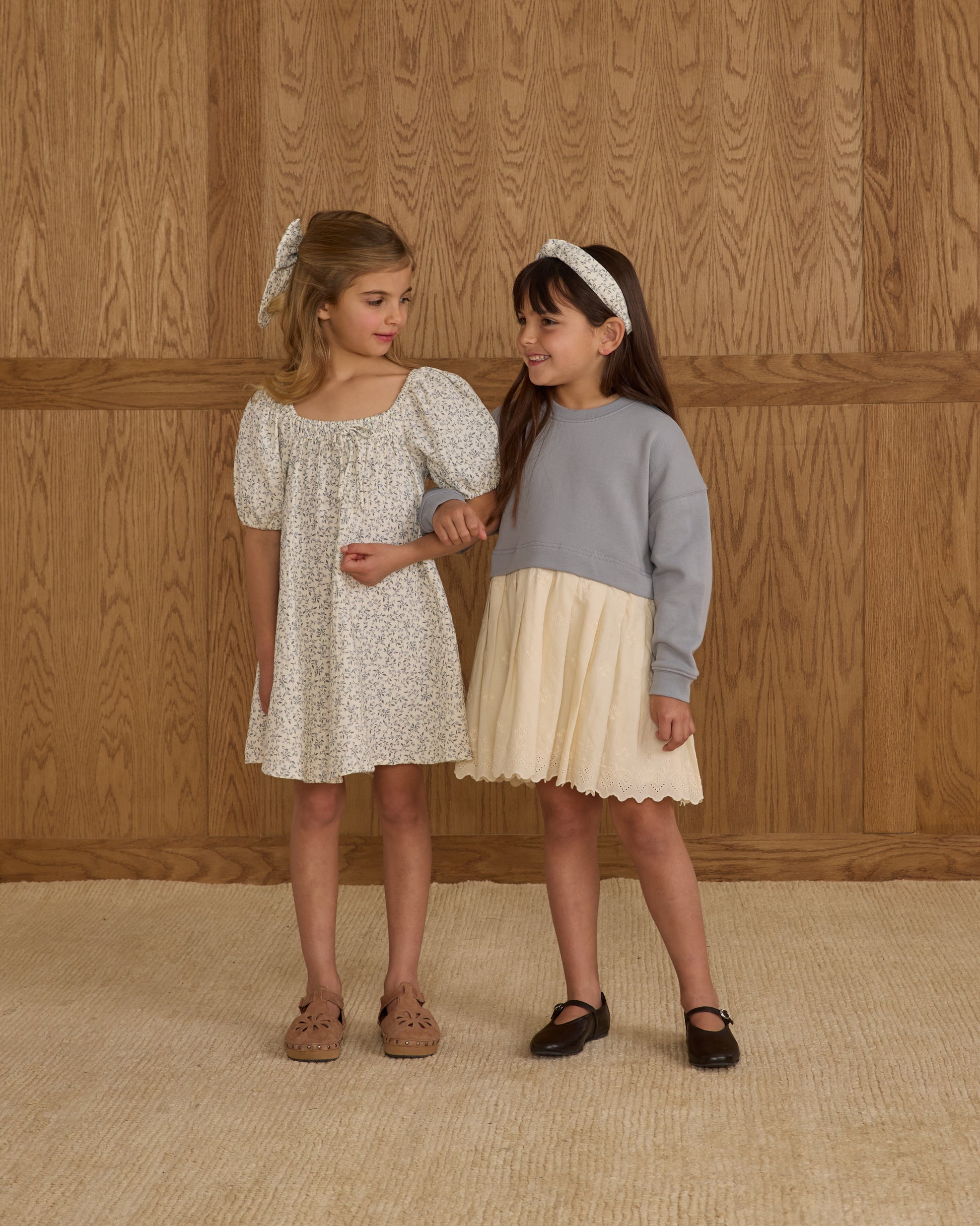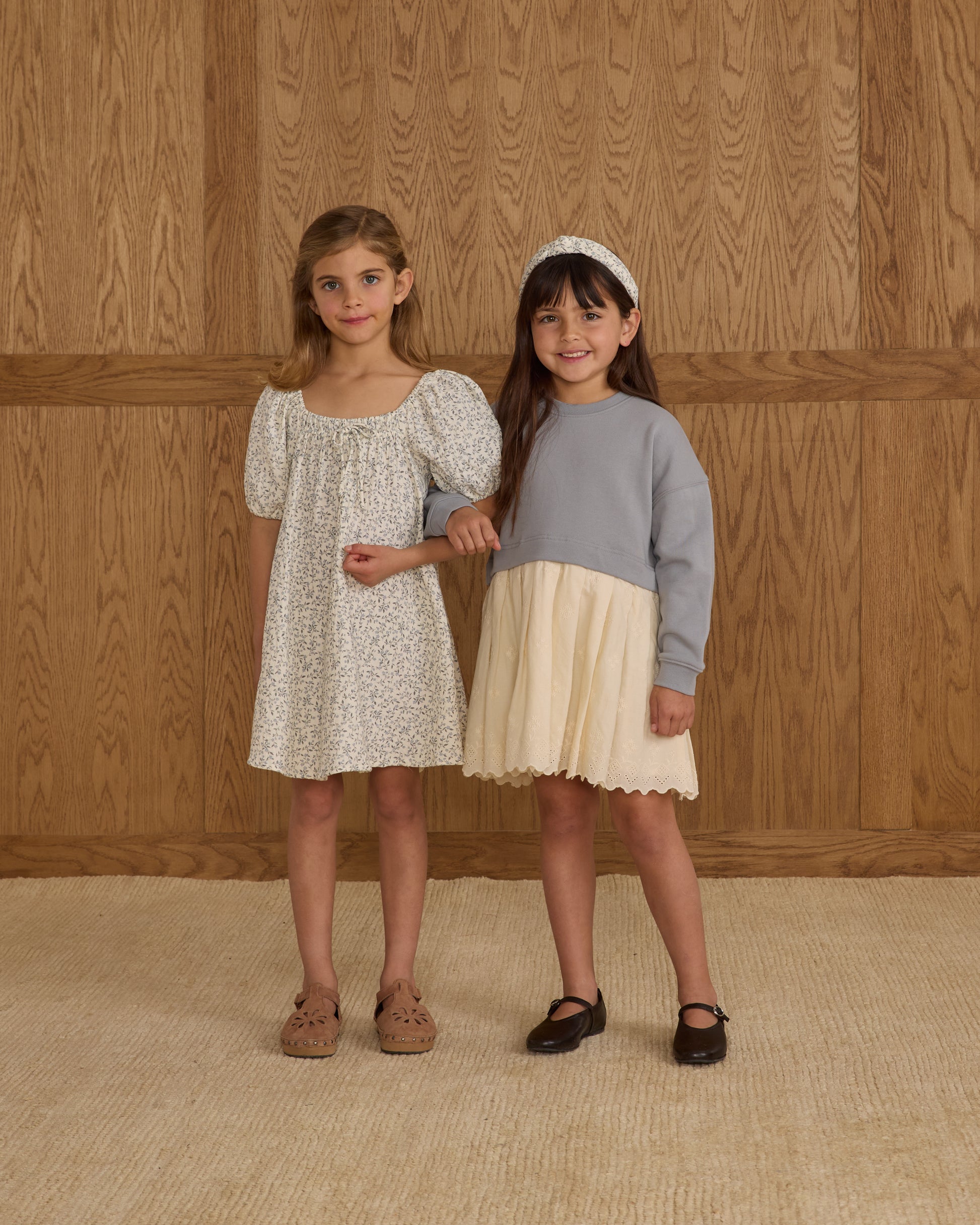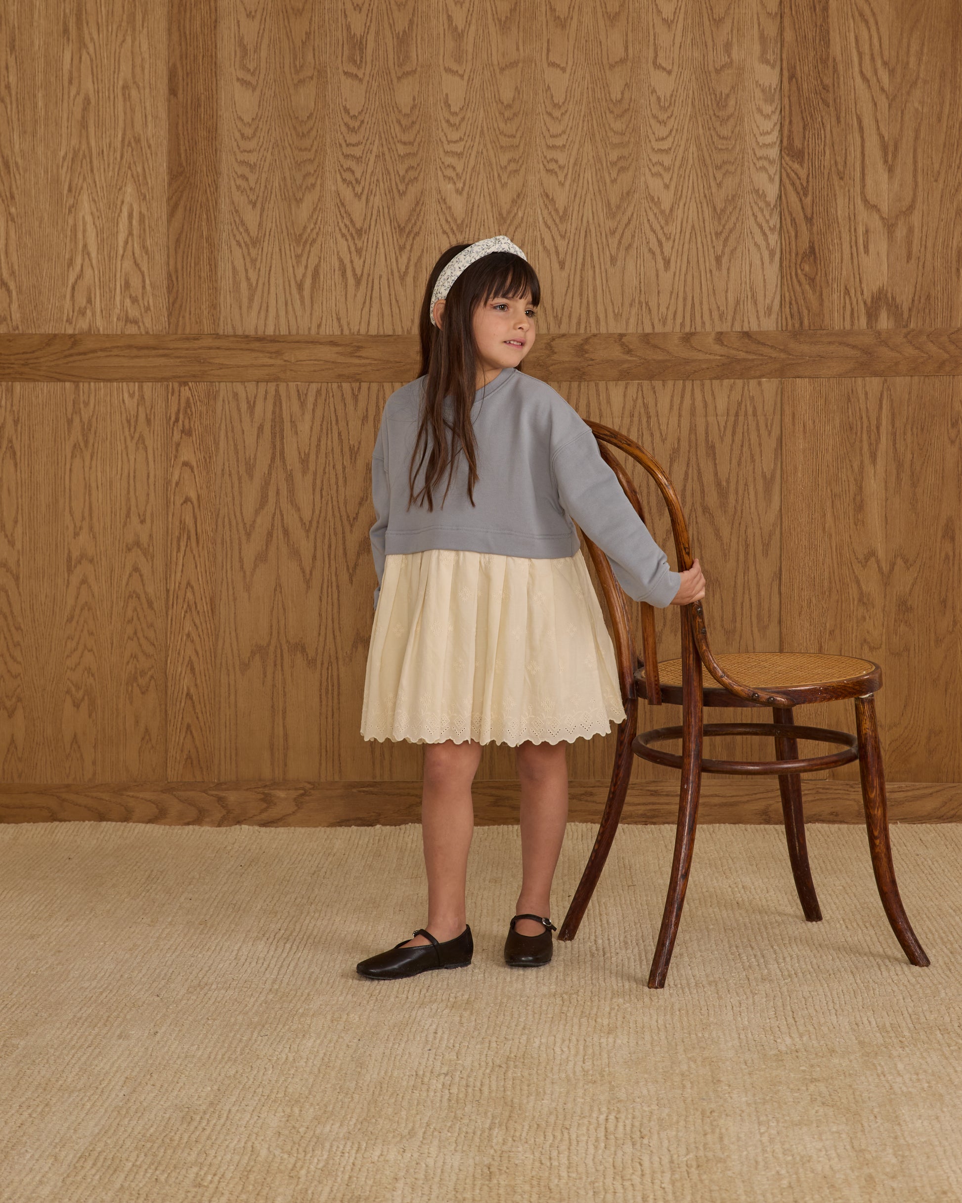 Sporty meets sweet in this dreamy sweatshirt dress 💙👗! With its soft dusty blue top and flowy eyelet skirt, it’s the perfect mix of cozy and twirly. Easy to throw on for school days, playdates, or weekend adventures, this dress makes comfy look oh-so-chic ✨.
