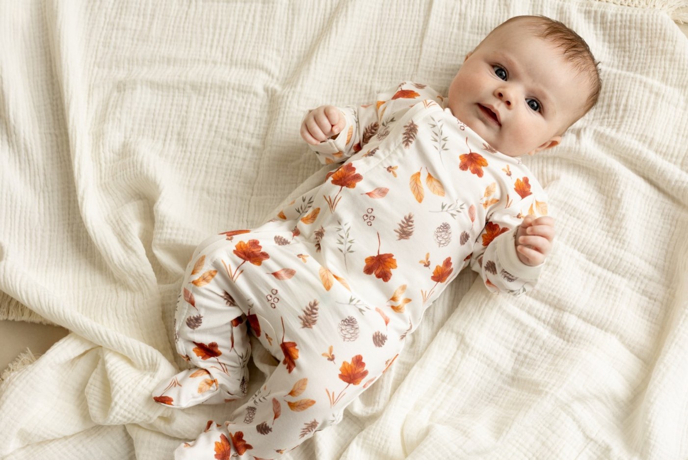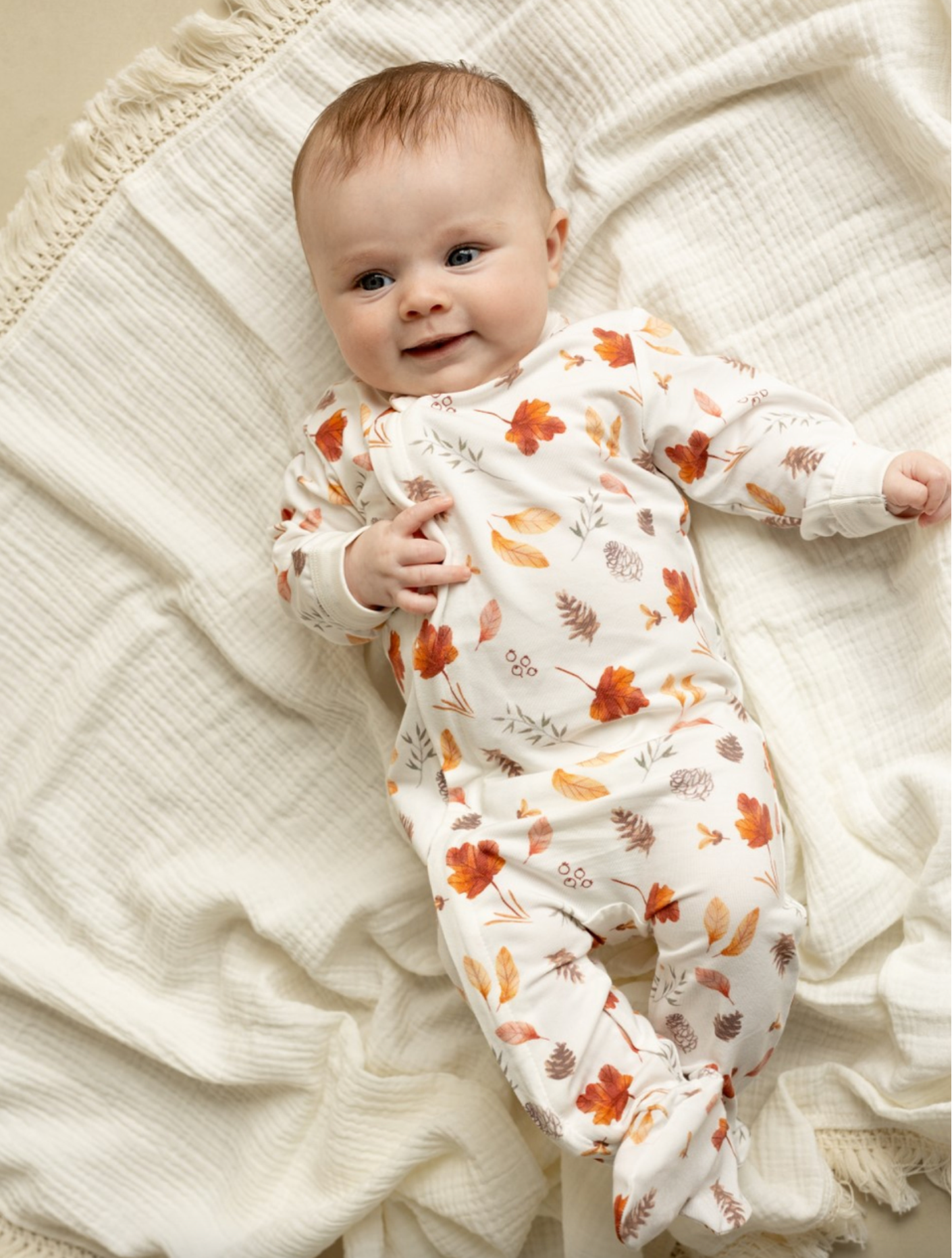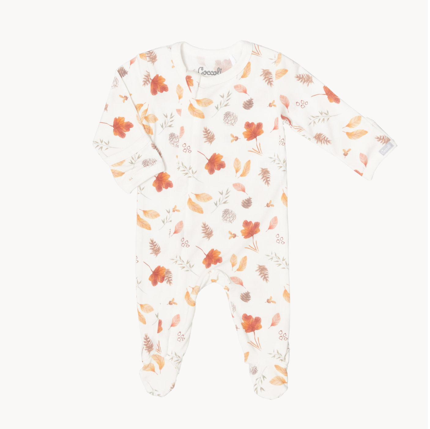 Experience ultimate coziness with the Fall on Cream Footie by Coccoli! This adorable footie boasts a gorgeous print of autumn leaves in soft hues, making bedtime even more lovable. Snuggle time with your little one just got better with the super soft material. #staylittle