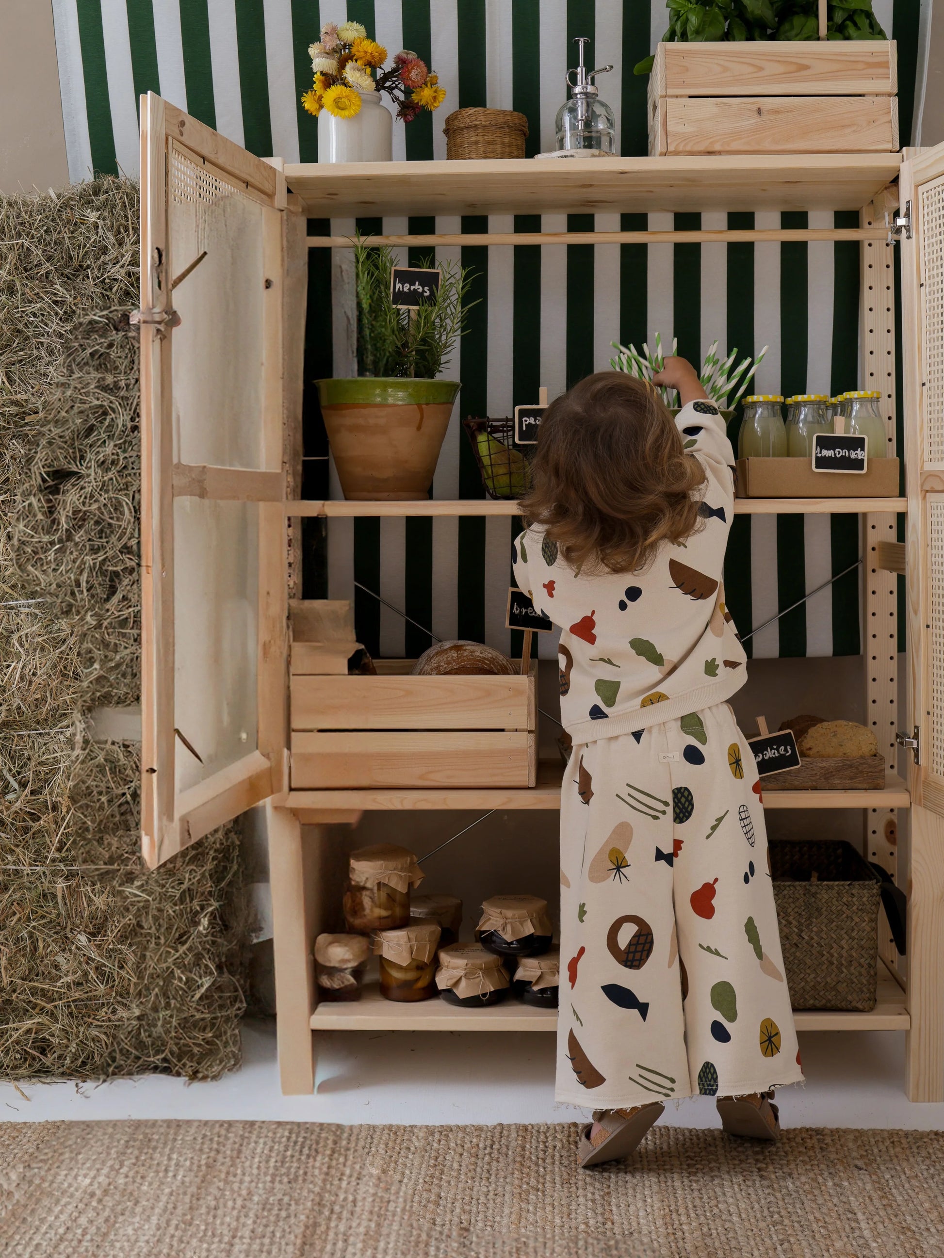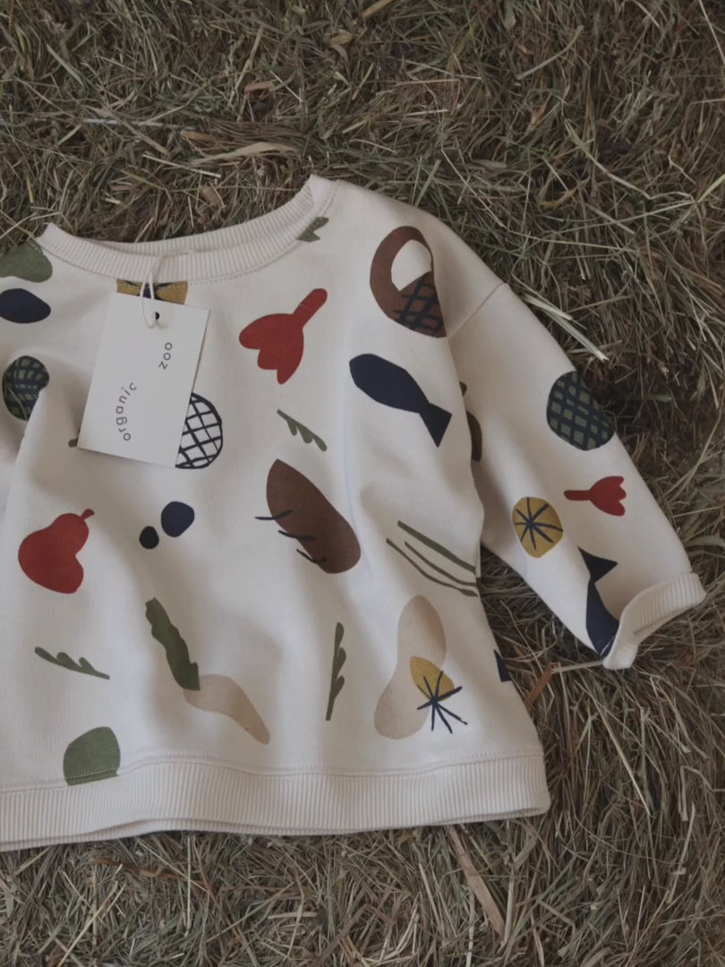 A true feast for the imagination! The Farmer’s Market Sweatshirt celebrates the joy of fresh fruit and veggies with its playful all-over print—lemons, broccoli, fish, carrots, and more 🍐🐟🍅. Soft and cozy in organic cotton, it’s perfect for keeping little ones warm on breezy market strolls or chilly garden adventures.