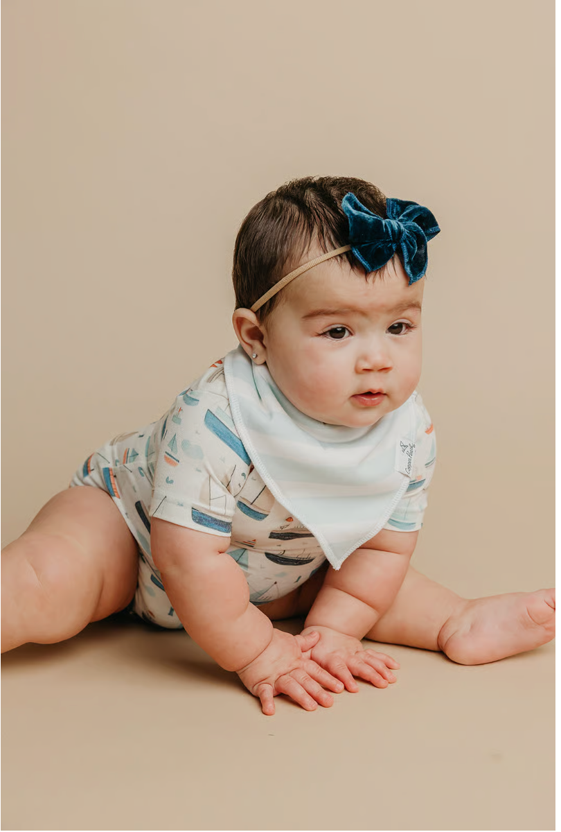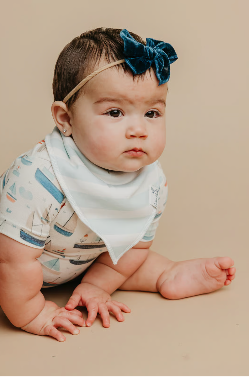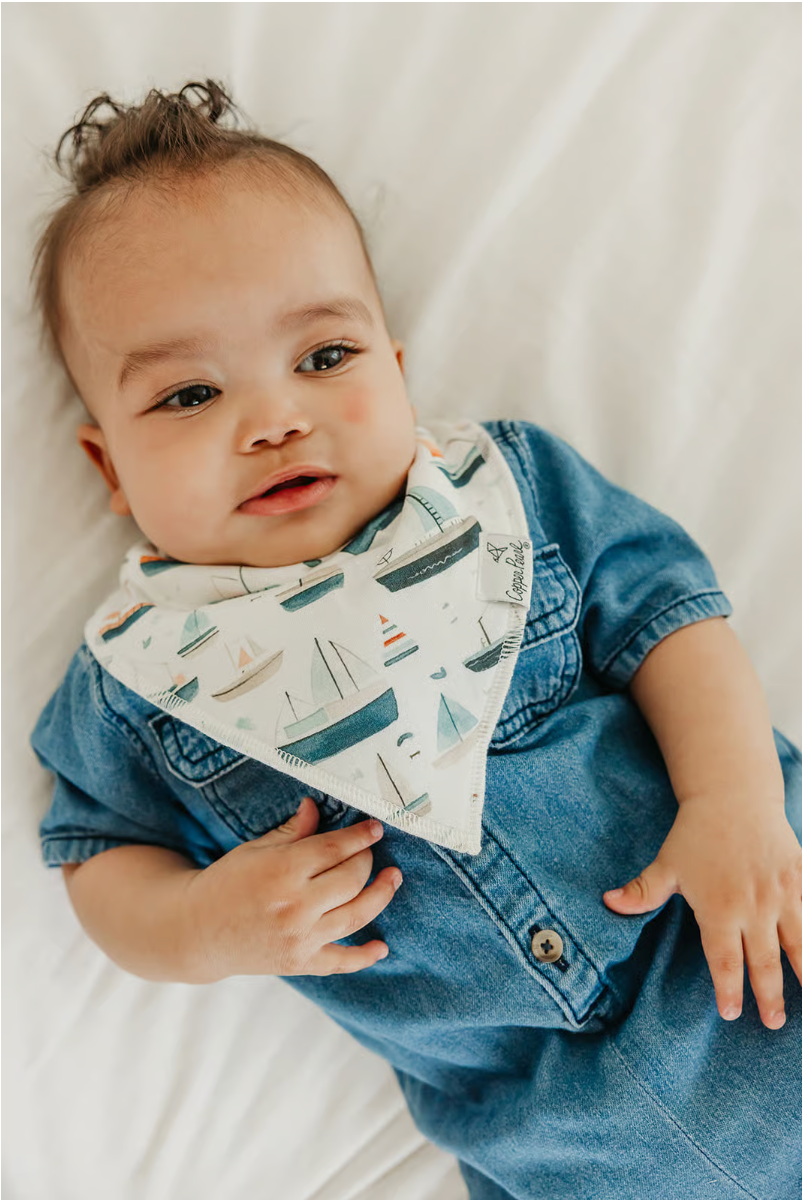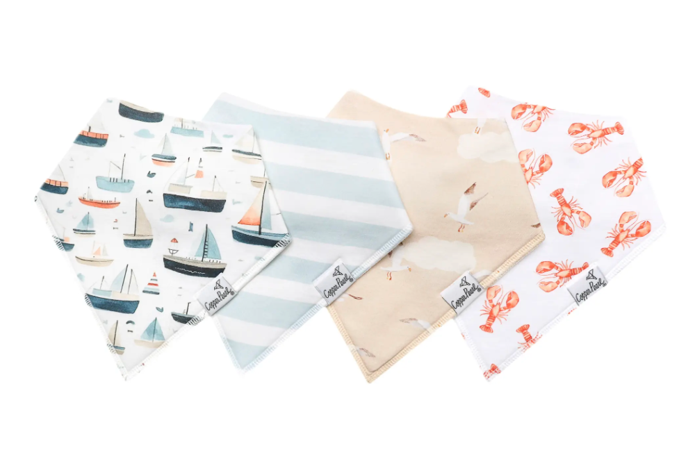 Say goodbye to boring bibs and hello to the Copper Pearl Fisher Bandana Bibs! Featuring a cool mix of sea-inspired blues and modern patterns, these bibs turn everyday drool and dribbles into a fashion statement.