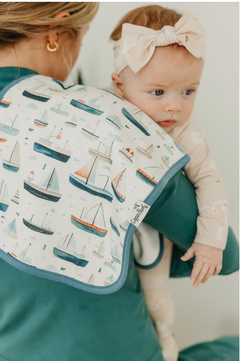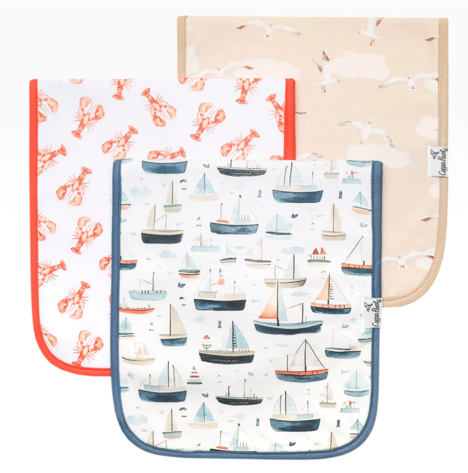 The Copper Pearl Fischer Burp Cloth is your first mate in keeping messes at bay—with a crisp nautical pattern featuring anchors, sails, and ocean hues that bring a splash of seaside charm to every clean-up.