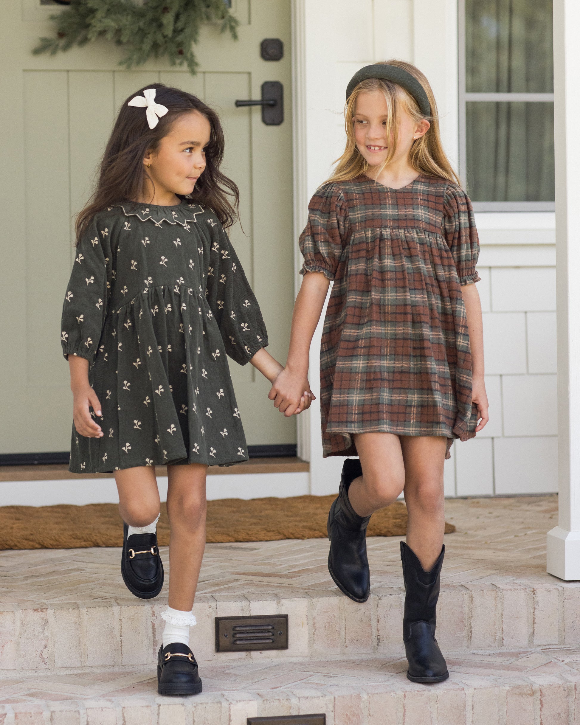 Like a little meadow brought to life in fabric, the Freya Blossom Embroidery Dress is a true treasure for twirls and everyday adventures. Crafted in soft, textured corduroy, it’s sprinkled with delicate ivory blossoms that feel as though they’ve been gathered from a frosty garden at first light. The scalloped neckline, stitched with the sweetest embroidery, adds a touch of old-world charm, while the full skirt and gentle gathers invite endless spins and storybook play.