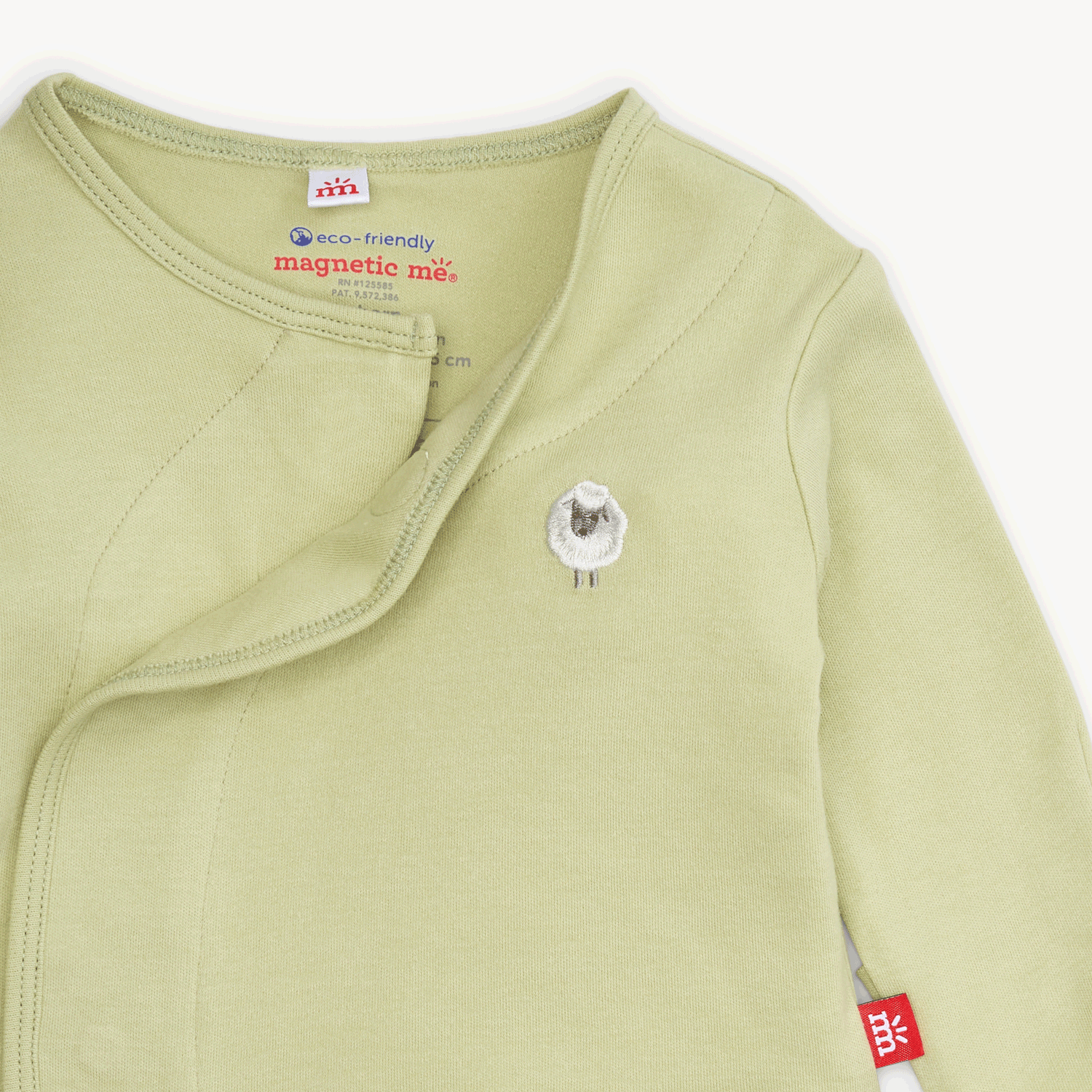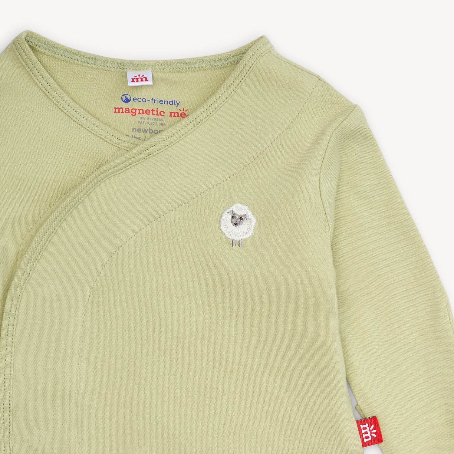 A soft sage wrap-style kimono top with a sweet embroidered sheep ๐