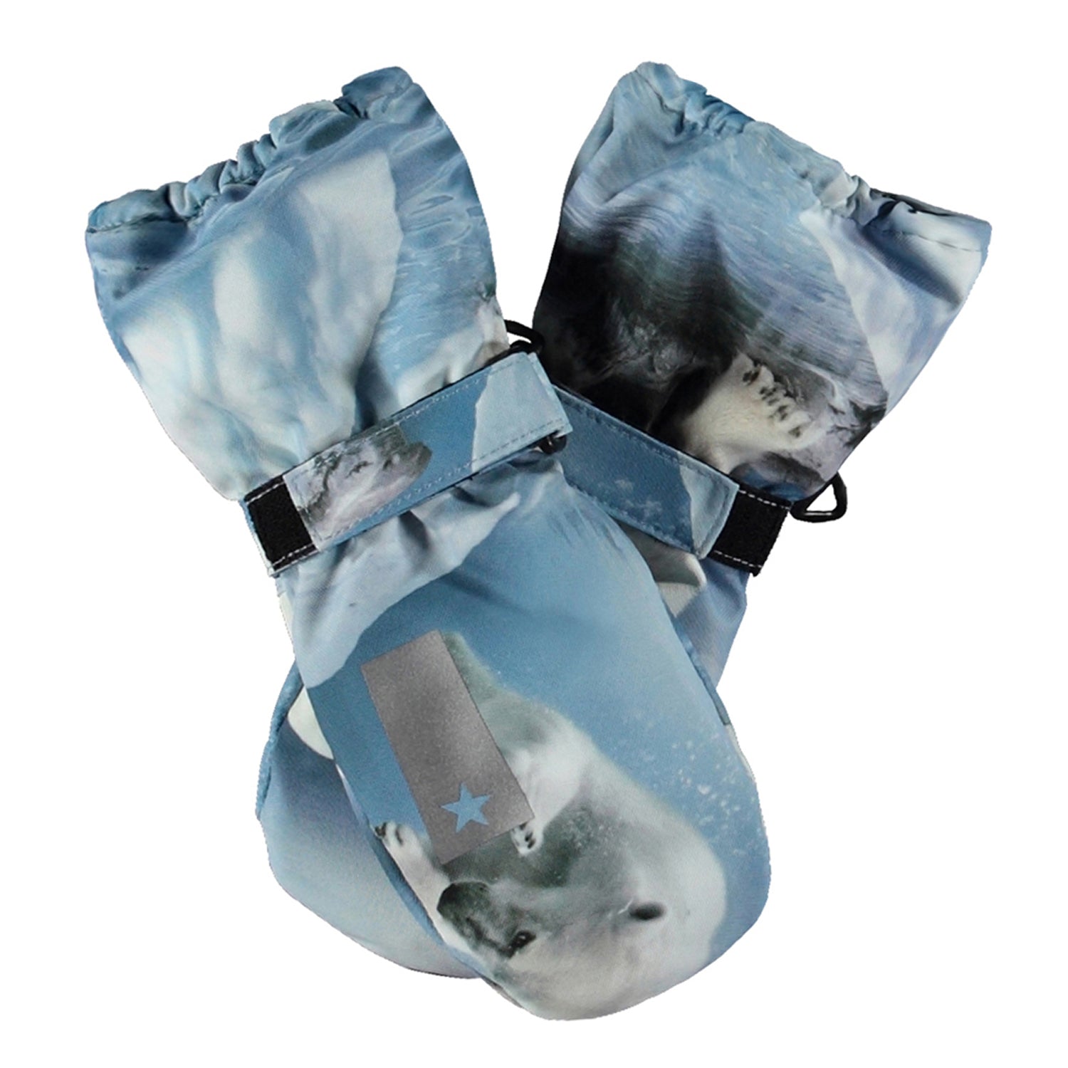 Blue, waterproof and breathable mittens with polar bear print and 3M™ Thinsulate™ insulation. The mittens have a reflector on the front, as well as elastic and adjustable Velcro at the wrist. Please note that the cuff on this model is slightly longer than on Mitzy, so there is no opening between the mittens and the jacket sleeve. Features: Water-repellent PFC-free impregnation Water column pressure: 15,000 mm. Breathability: 15,000 g/m2/24h 3M Thinsulate TM insulation Please note that size 1-2 years has a zipper in the cuff instead of Velcro closure.