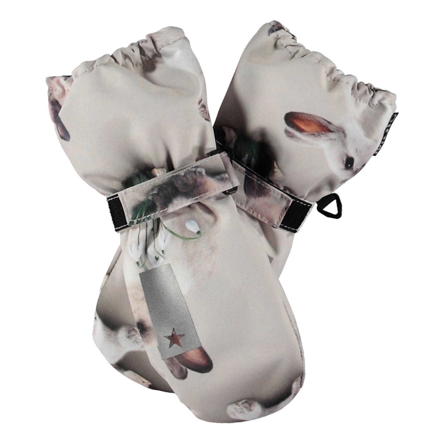 Light grey, waterproof and breathable mittens with rabbit print and 3M™ Thinsulate™ insulation. The mittens have a reflector on the front, as well as elastic and adjustable Velcro at the wrist. Please note that the cuff on this model is slightly longer than on Mitzy, so there is no opening between the mittens and the jacket sleeve. Features: Water-repellent PFC-free impregnation Water column pressure: 15,000 mm. Breathability: 15,000 g/m2/24h 3M Thinsulate TM insulation.