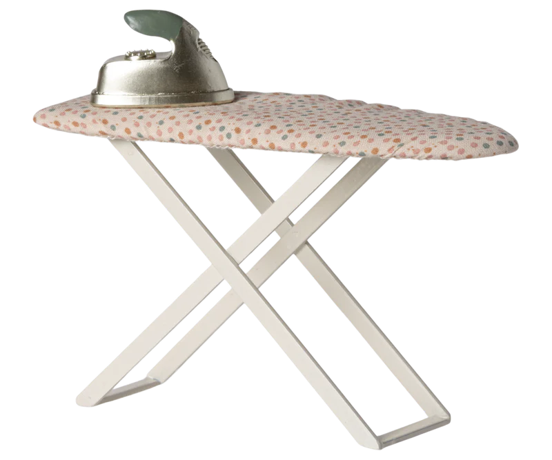 To make the laundry room fully equipped, you must have an iron and iron board. This set will make the play even more authentic. The iron board is made in metal and covered with unique Maileg fabric. It is perfect in size for the mouse family.