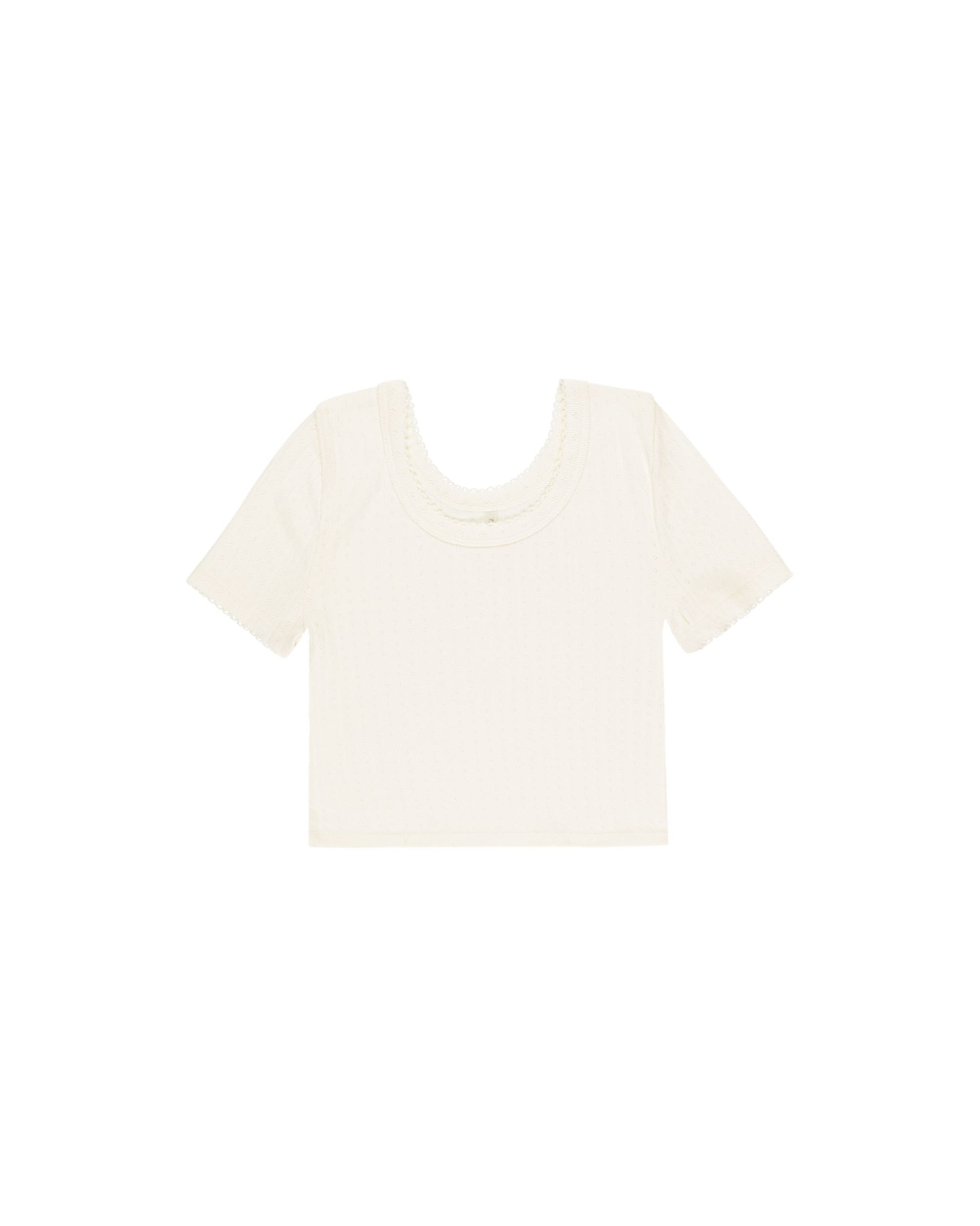 Elevate your wardrobe with our Ivory Pointelle Tee! This one-of-a-kind piece features a soft neckline and short sleeves, while the beautiful pointelle fabric adds a unique dimension. Add a playful touch to your style and pair it perfectly with pieces from Rylee & Cru's SS25 line.