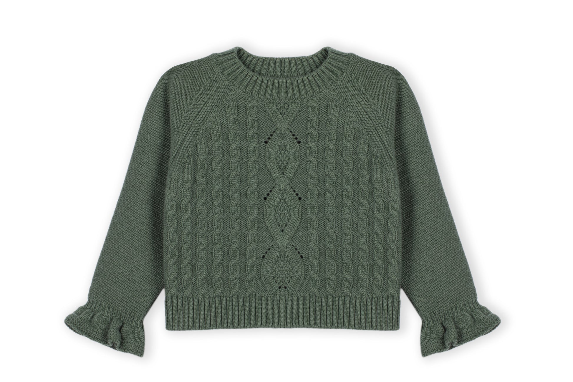 A sweater made for adventures big and small! In a rich forest green hue, this knit treasure features intricate cable details and the dreamiest ruffle-trimmed sleeves. Just the right mix of whimsy and warmth, it’s perfect for layering on crisp autumn days or cozy evenings by the fire. 🔥🍂