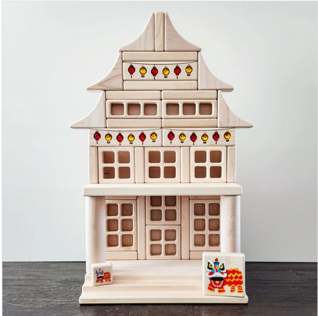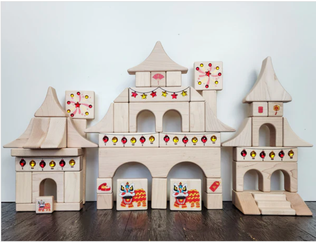 This charming duo includes two beautifully shaped wooden blocks designed to resemble lanterns and banners, each inlaid with faceted acrylic gem accents that catch light and cast warm, glowing reflections. Whether used as part of a larger block town, as stage props for tiny storytellers, or simply held up to the sun to watch color dance across the room, these pieces invite playful exploration and sensory delight.