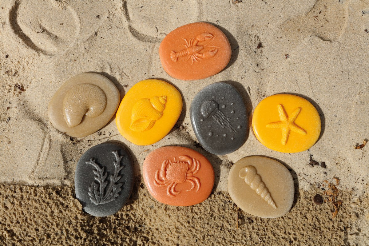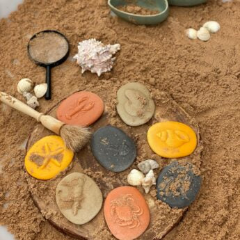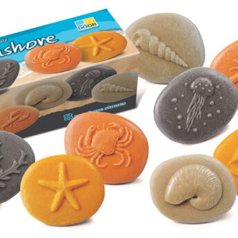 Be transported to the ocean and explore the enticing flora and fauna of the seashore with these tactile stones. Durable for use in their natural environment, in water and sand, they are perfect for outdoor discoveries and investigative play, and can easily be cleaned for the next adventure! Why not take them on a beach trip and compare with some real natural treasures? They can be used to create small world rockpools, to make imprints in play dough and to take crayon rubbings. Children will enjoy such activities, learning more about one of the richest and diverse environments on the planet. Set contains eight stones: auger shell, crab, jellyfish, lobster, nautilus shell, seaweed, starfish and whelk shell. Stones measure approx 2¾”. Safe for 2+.