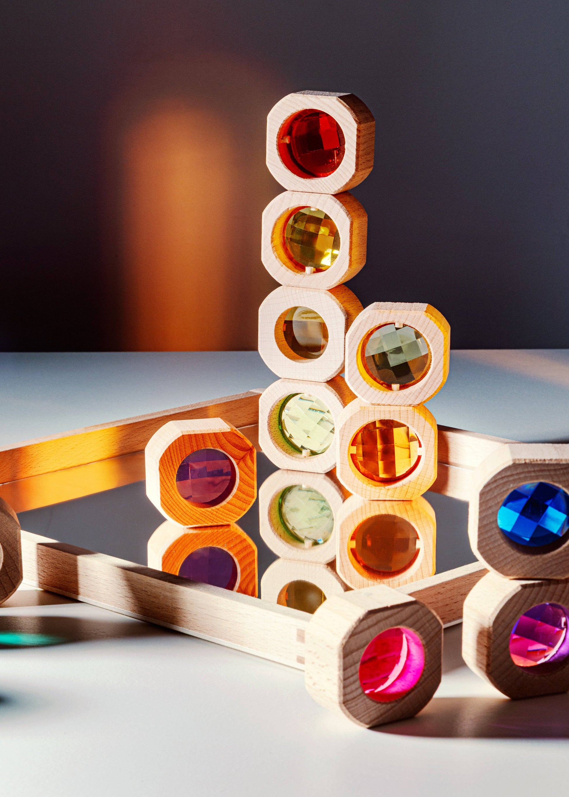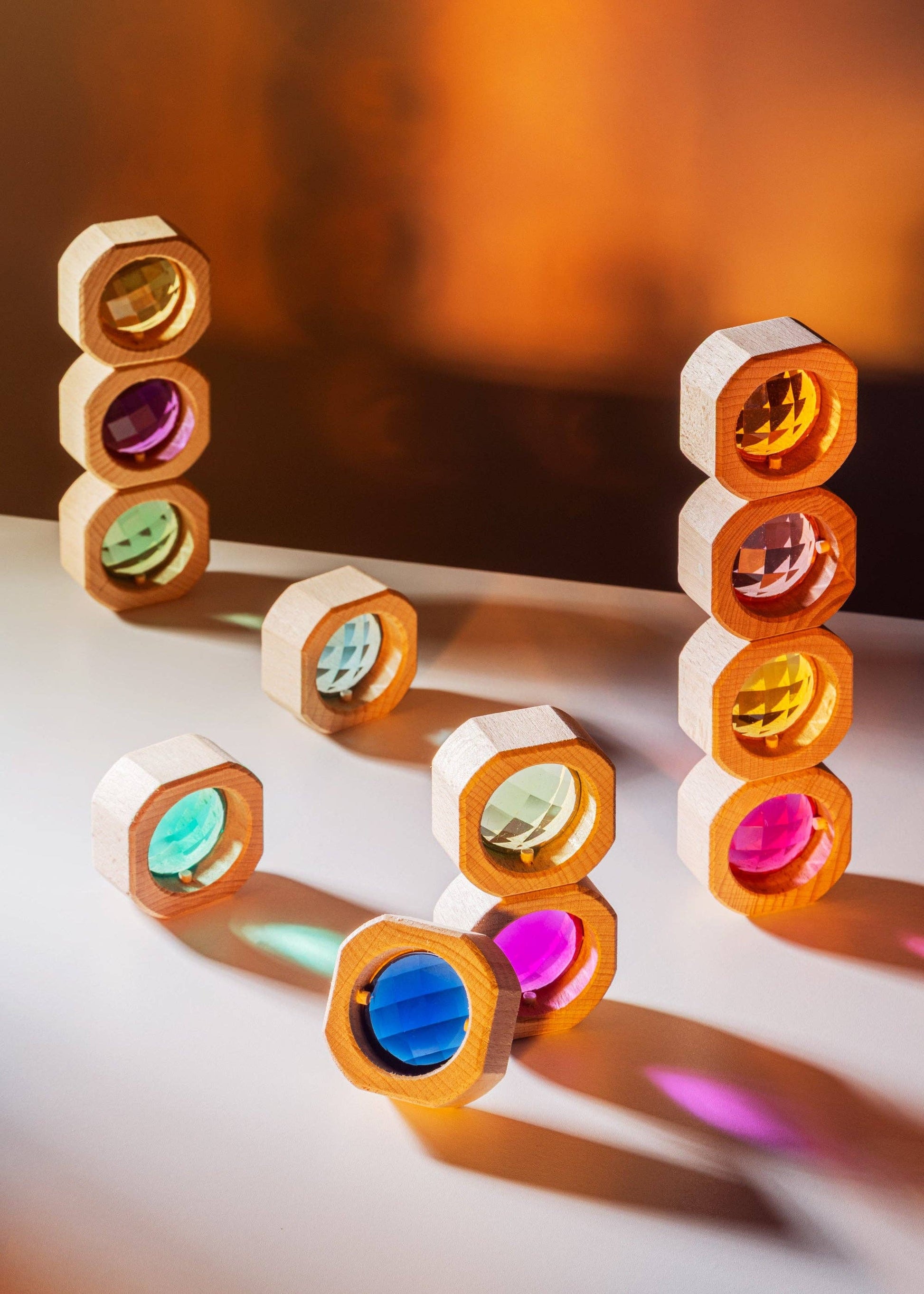 Crafted with heirloom-quality care, each block features a smooth wooden frame paired with radiant, faceted acrylic gems that shimmer when stacked or held up to the sun 🌞 Children will love exploring light, color mixing, and symmetry as their creations cast glowing reflections across floors and play tables.