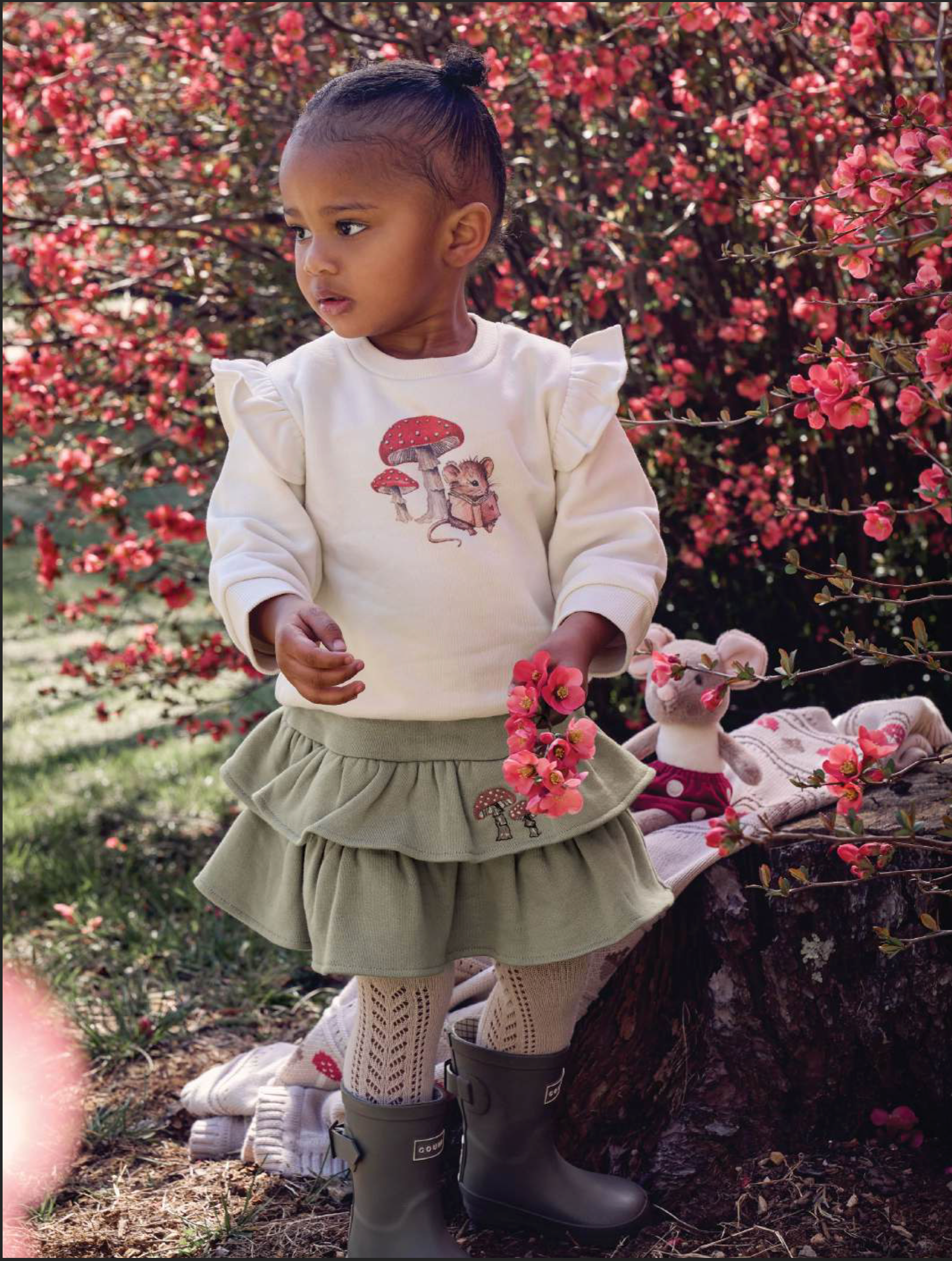 Bring a sprinkle of storybook charm to your little one’s wardrobe with this Magical Mouse Organic Fleece Set! The soft cream pullover features fluttery ruffle sleeves and the sweetest woodland scene—a curious mouse tucked under toadstools, ready for an adventure. Paired with a sage green tiered ruffle skirt, embroidered with matching mushrooms, this outfit is full of forest whimsy and cozy charm. 🌿✨