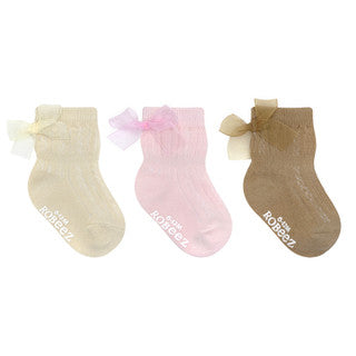 🎀✨ A bow on top makes everything sweeter! This Robeez 3-pack of cable knit socks is all about dainty charm — in soft neutral shades of cream, blush pink, and warm mocha, each topped with a dreamy organza bow. Perfect for peeking out of tiny shoes, dressing up everyday outfits, or adding a sprinkle of fairy-tale flair to special occasions 🧚♀️💫. Cozy, stretchy, and oh-so-adorable… they’re basically happily ever after for little toes 👣💖.