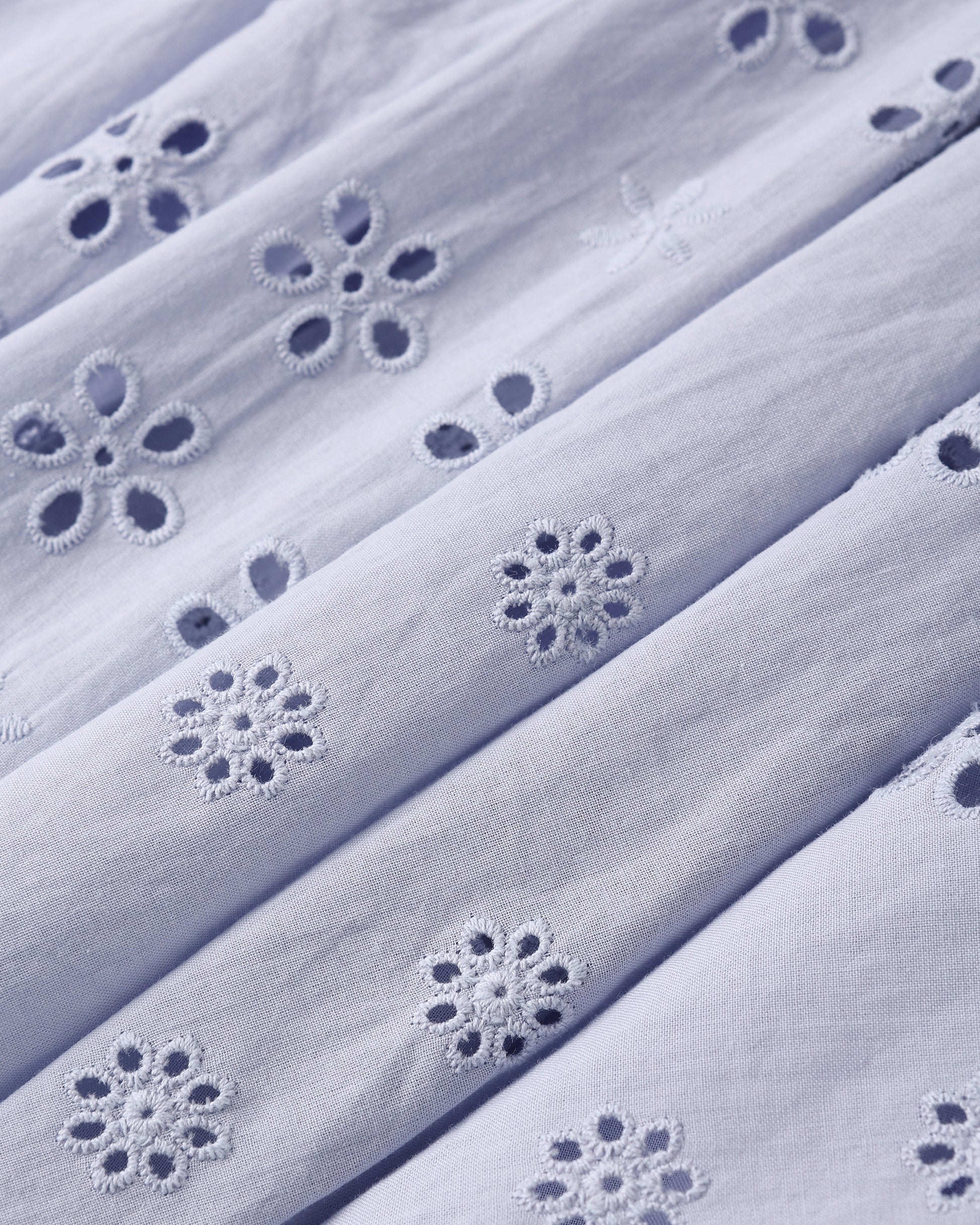 Rendered in the softest periwinkle hue with delicate floral eyelet throughout, this dress was made for twirling. The gentle gathers create that perfectly swishy skirt, while the intricate cutwork adds texture and heirloom-inspired charm.