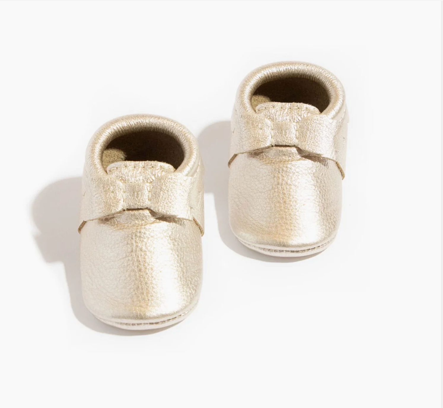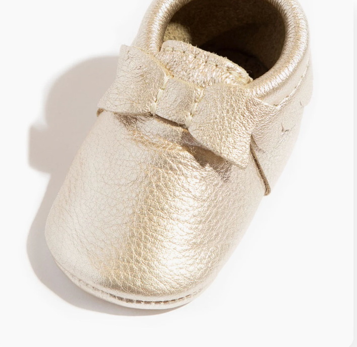 Our Platinum Bow Shoes add a touch of sweet and delicate style to your little one's outfit. Made with full-grain leather from our favorite Platinum material, these moccasins are designed to go with everything. Perfect for your fashionable little one!