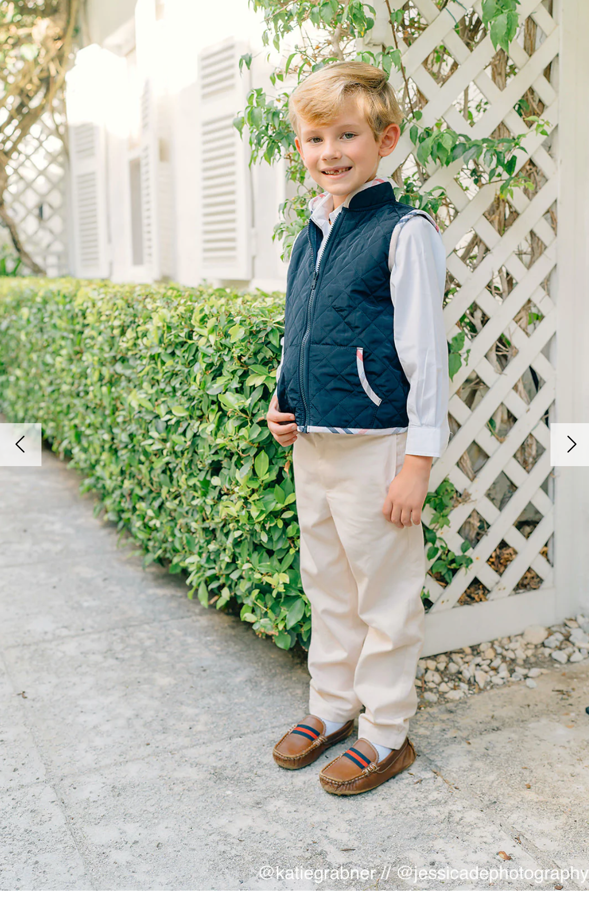Introducing our Printed Trim Puffer Vest for your young man. Made with soft textures and contrasting trim, this vest is the perfect layer for cooler fall mornings. Versatile and stylish, pair it with our Bouden Plaid Buttondown for an amazing look. Pair with either jeans for an outdoor adventure or cords for a polished twist!