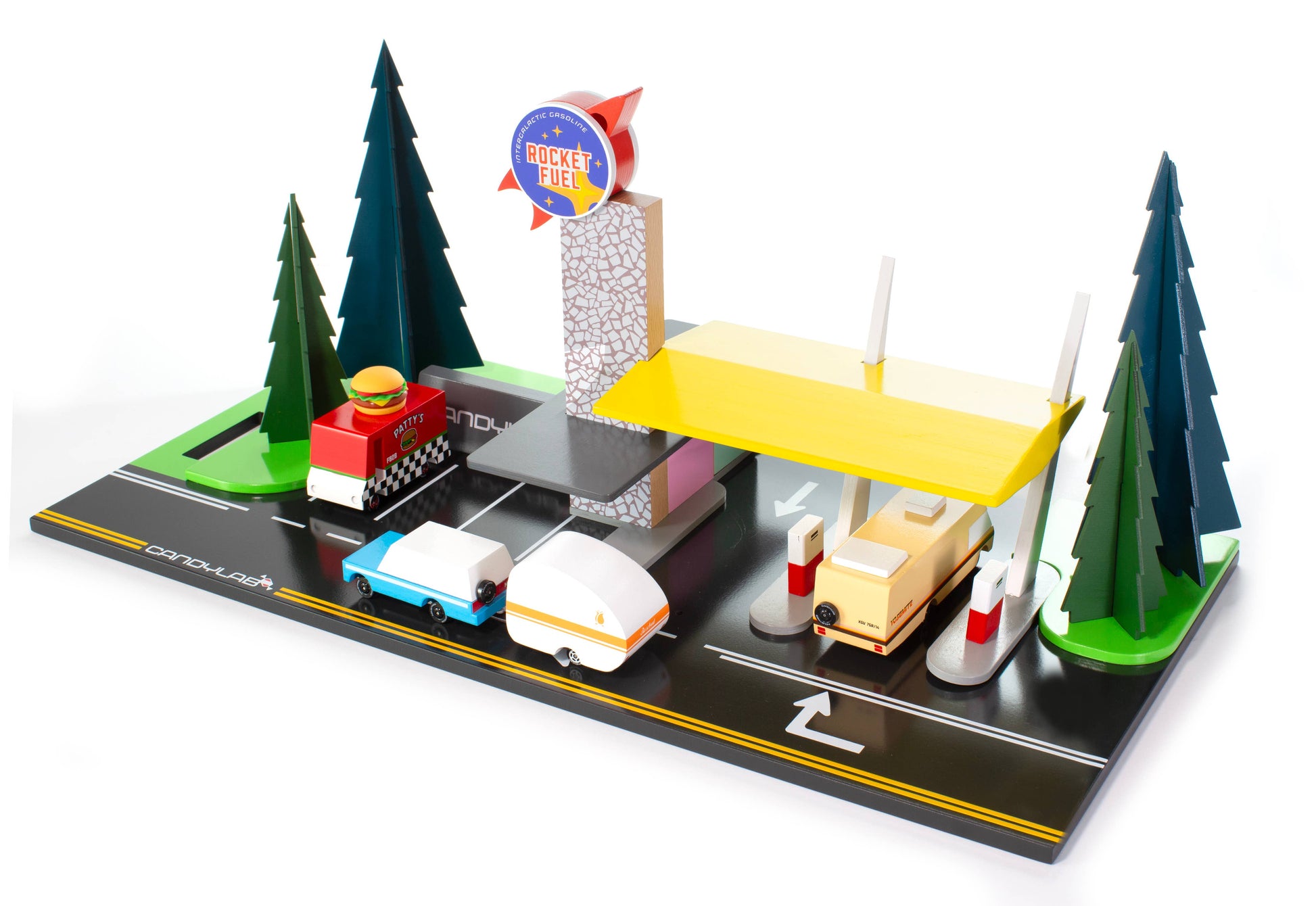 Sell more awesome wooden toys with an in-store display! Availability: Available to ship immediately. Candylab reserves the right to change the items offered with the display, depending on order composition, stock availability, etc. Includes: 1X Fuel Station, 3X Trees, 4X Cars
