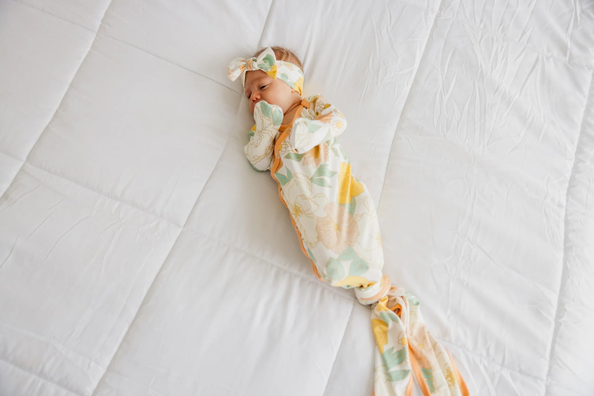 Crafted from buttery-soft fabric and kissed with a garden of blushy roses, this gown is perfect for first snuggles, sleepy smiles, and swoon-worthy newborn photos. The knotted bottom makes midnight diaper changes a breeze (even for sleep-deprived grown-ups 😉), and the pull-down shoulders make dressing your little petal pure magic.