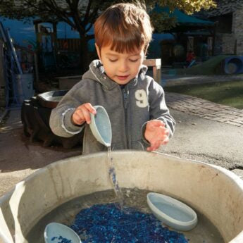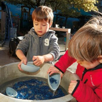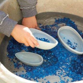 These charming rustic pourers are robust enough to be used outside with a range of materials and will enhance sand, water and muddy play. Easy to hold, they can be used to scoop and pour liquids and solids. Ideal for exploring and comparing volumes, the shaped lip makes pouring intuitive and easy for young learners. Set includes three tactile pourers measuring between 4 – 6″. Suitable for ages 18 months and beyond.