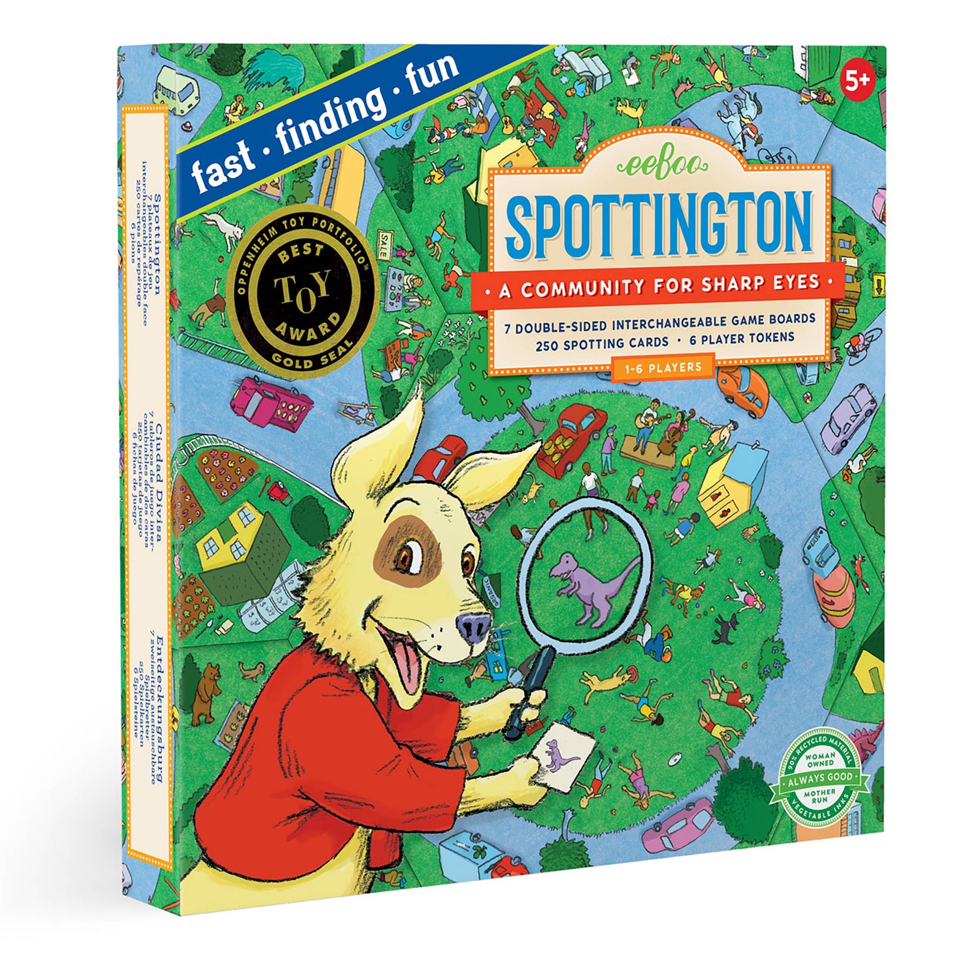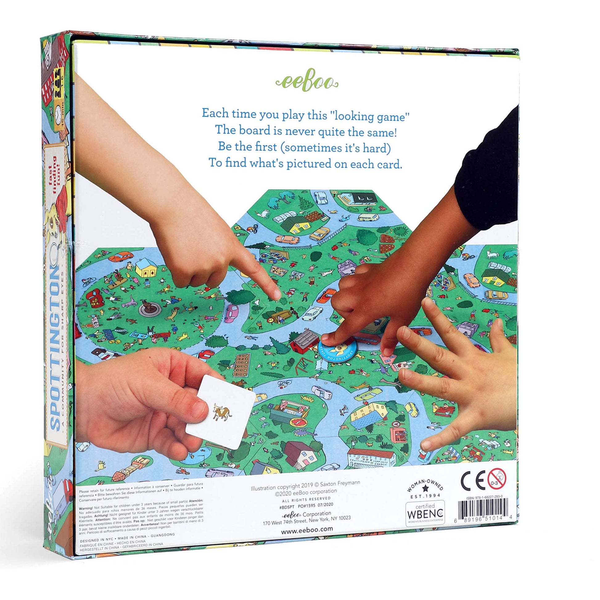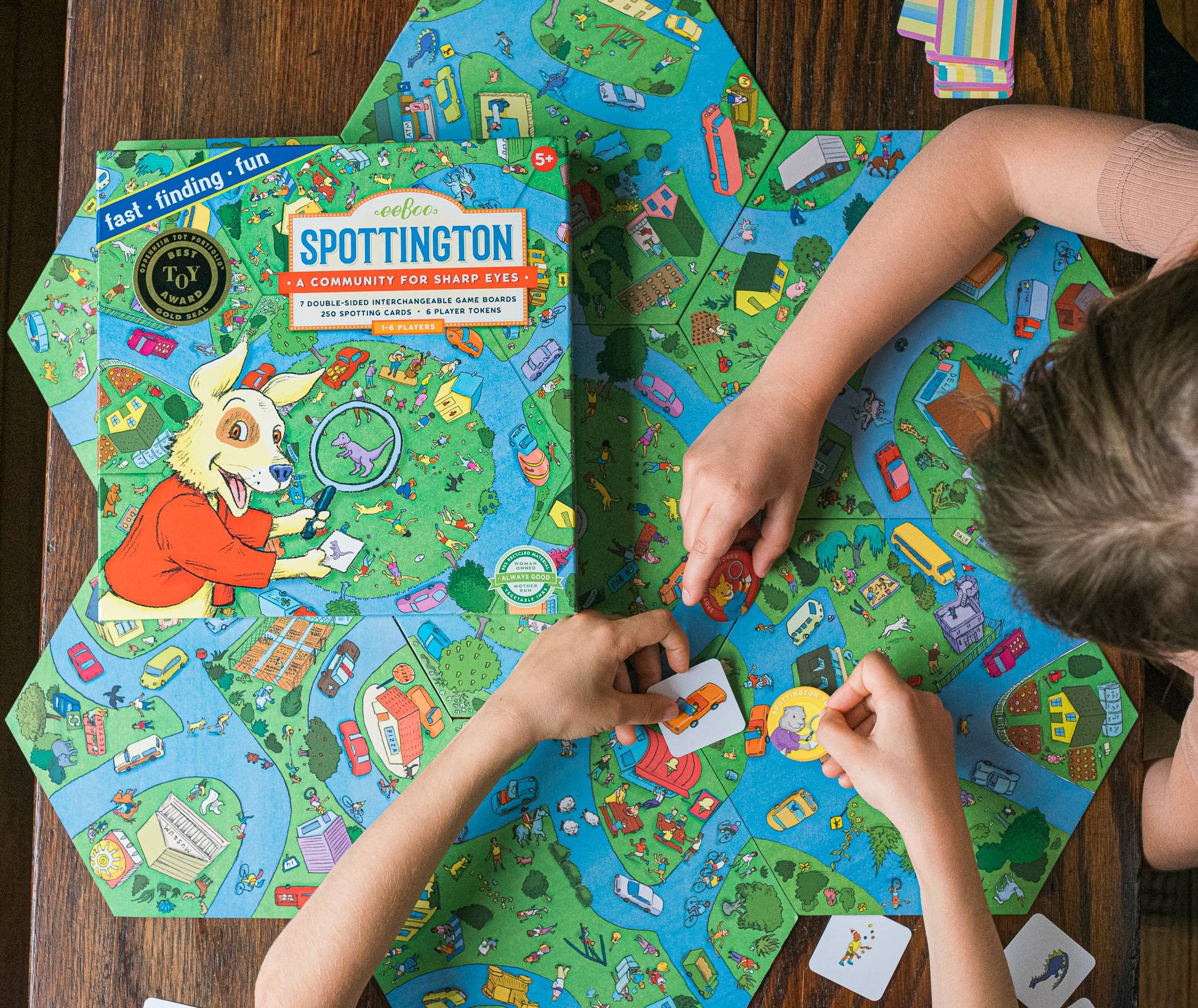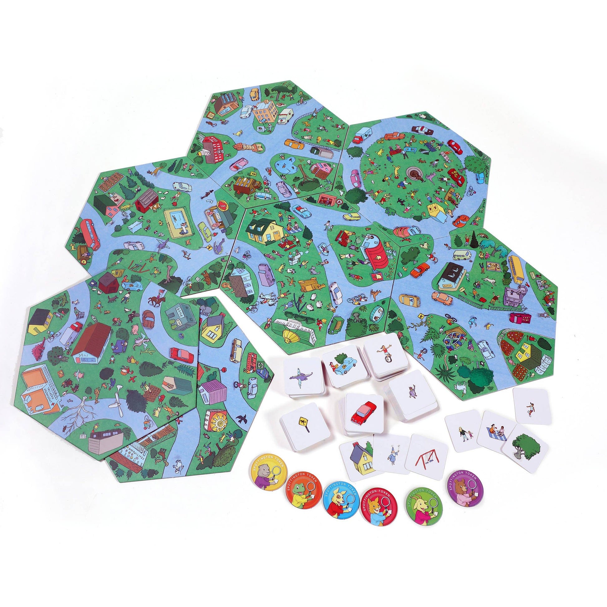 Gather around the busy village of Spottington! Lay one central board down with the other six surrounding it. Take turns flipping over a card and racing to locate what’s on the card. Once you’ve found it, place your token on the character or item and call out “Spottington.” Whoever finds the most the quickest is now the Mayor of Spottington.