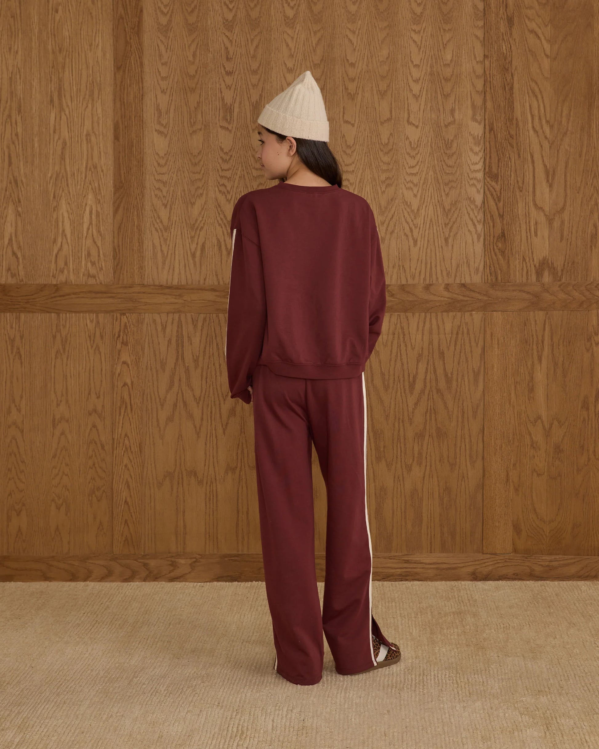 Casual never looked so effortlessly chic. The Teen Oversized Sweatshirt by Rylee & Cru in deep burgundy features a relaxed silhouette with bold retro-inspired stripes down the sleeves and a subtle “R.C” embroidered detail.