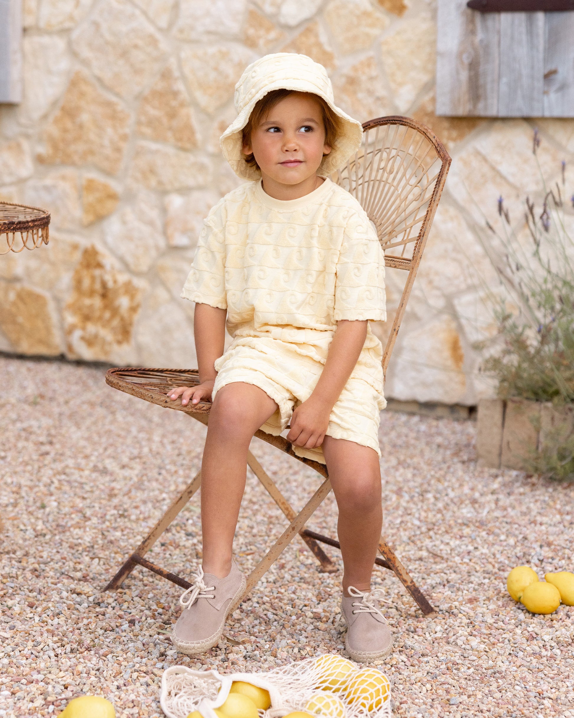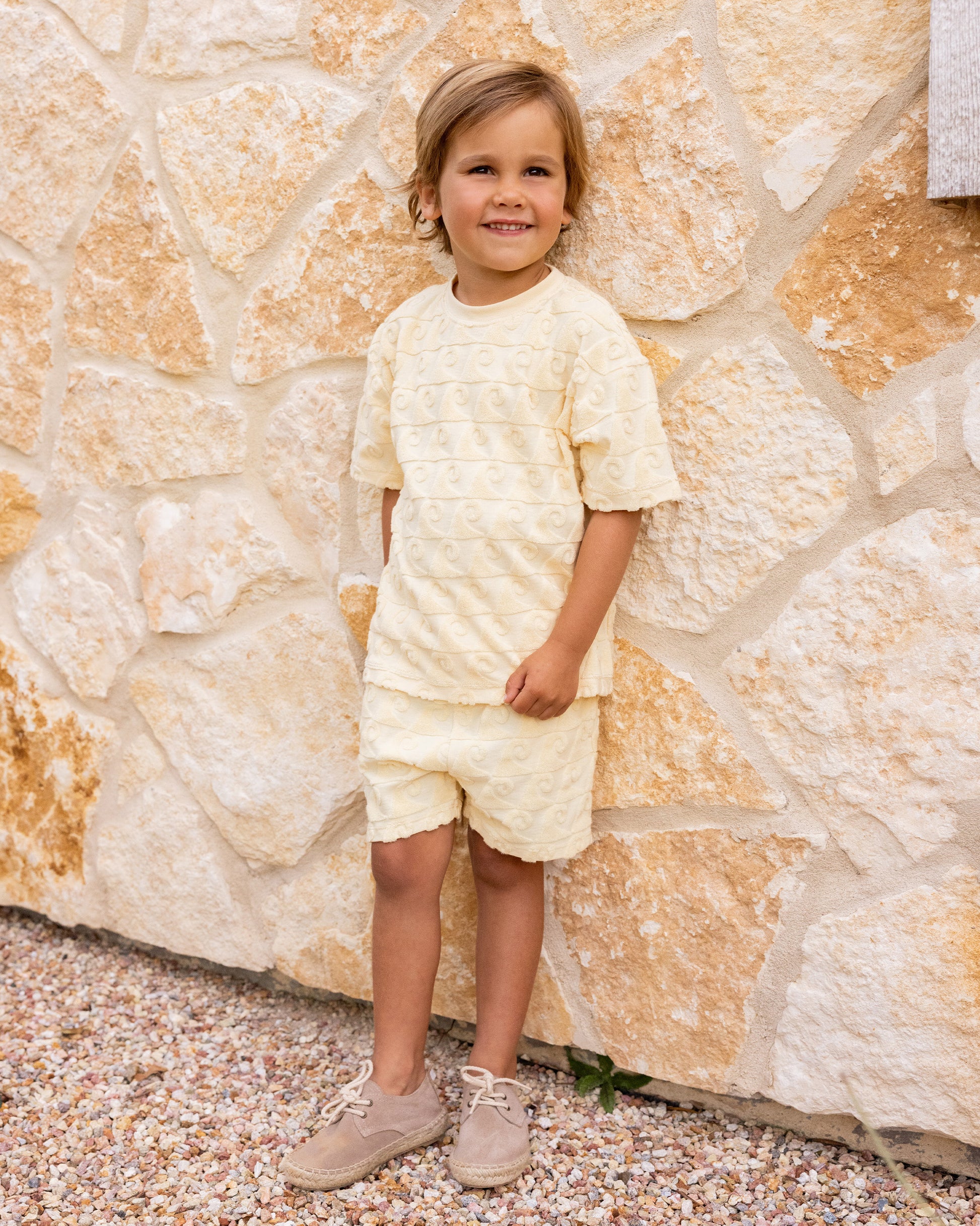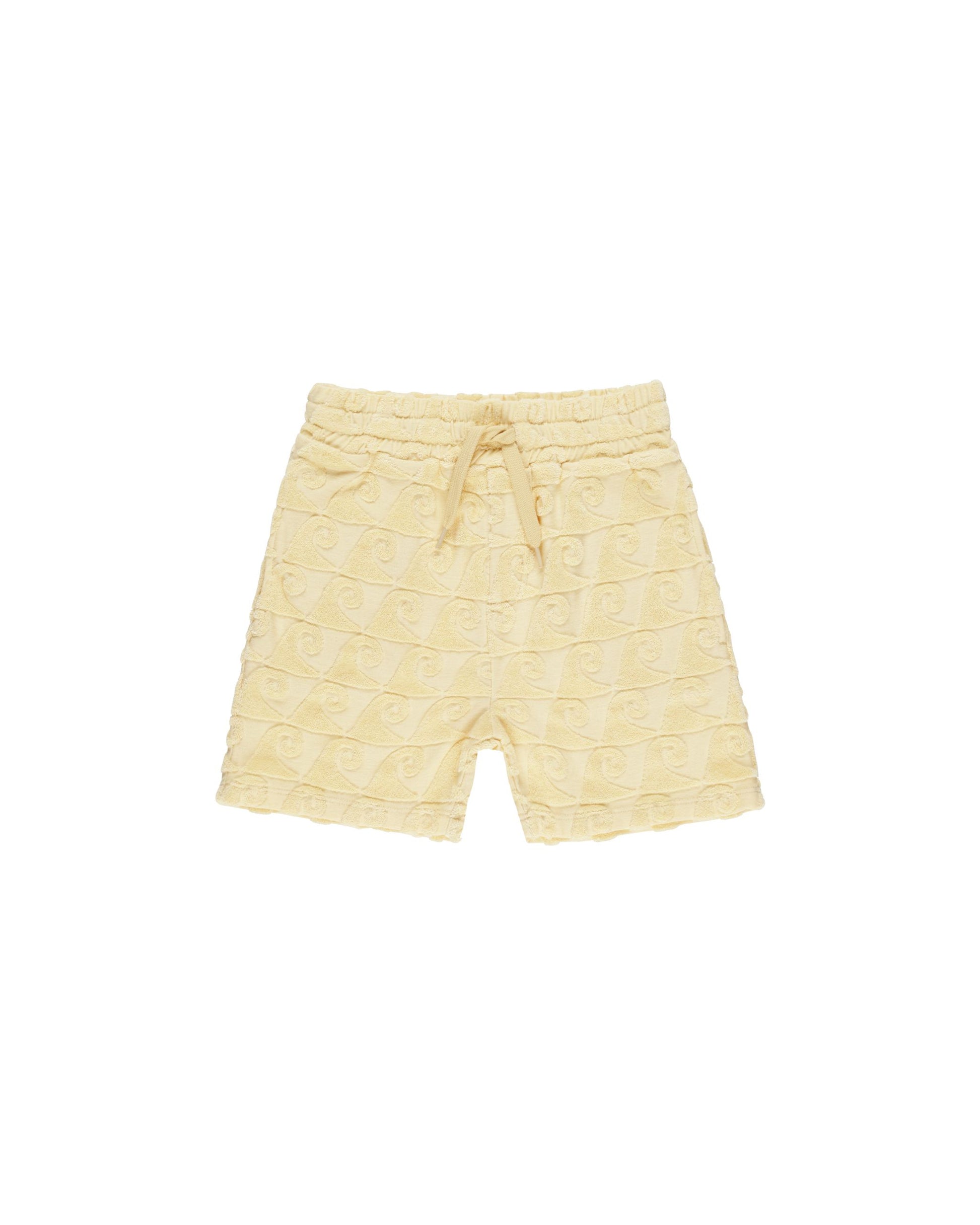 Surf's up with Terry Waves Boys' Shorts! These beach-ready terry shorts in a sunny yellow hue are perfect for catching some waves and having fun in the sun. Get ready to make a splash with their playful and comfy design. Cowabunga!