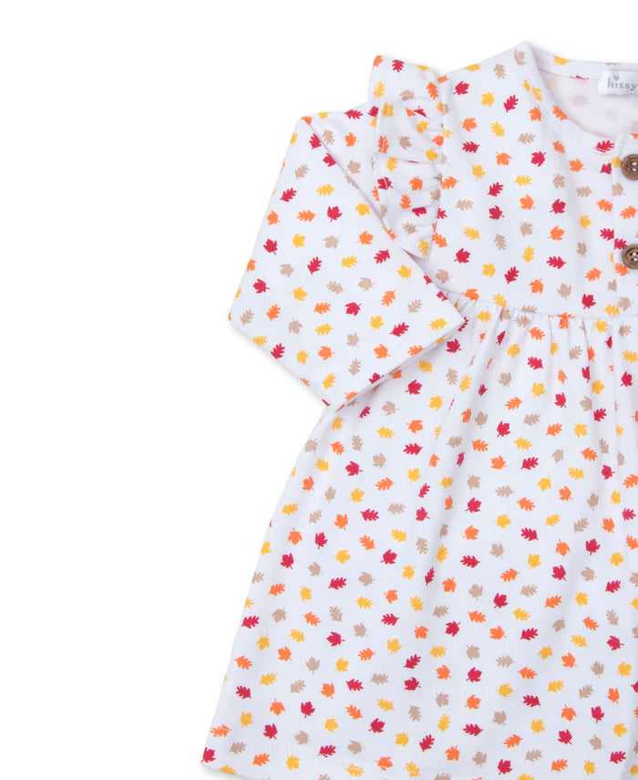 A darling dress set from our Turkey Time collection, crafted from the finest Peruvian cotton. It features a pretty autumn leaves print, ruffles, and timeless design. Two piece outfit includes dress and leggings.