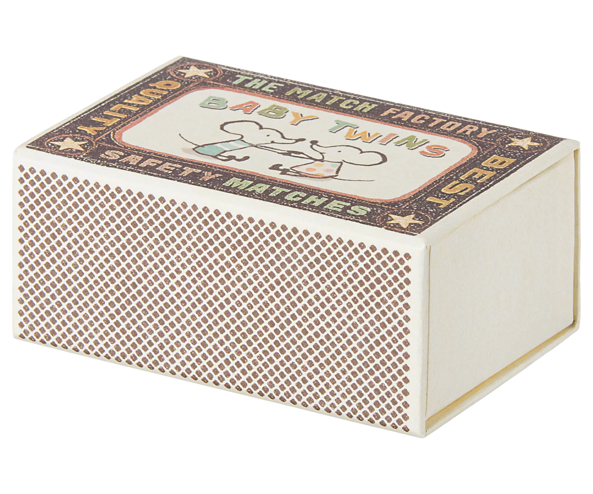 A classic Maileg item. These baby twin mice sleep safely in their sleeping bag side by side, tucked in the matchbox bed. These mice fit all accessories in size baby mouse. Fabric may vary.