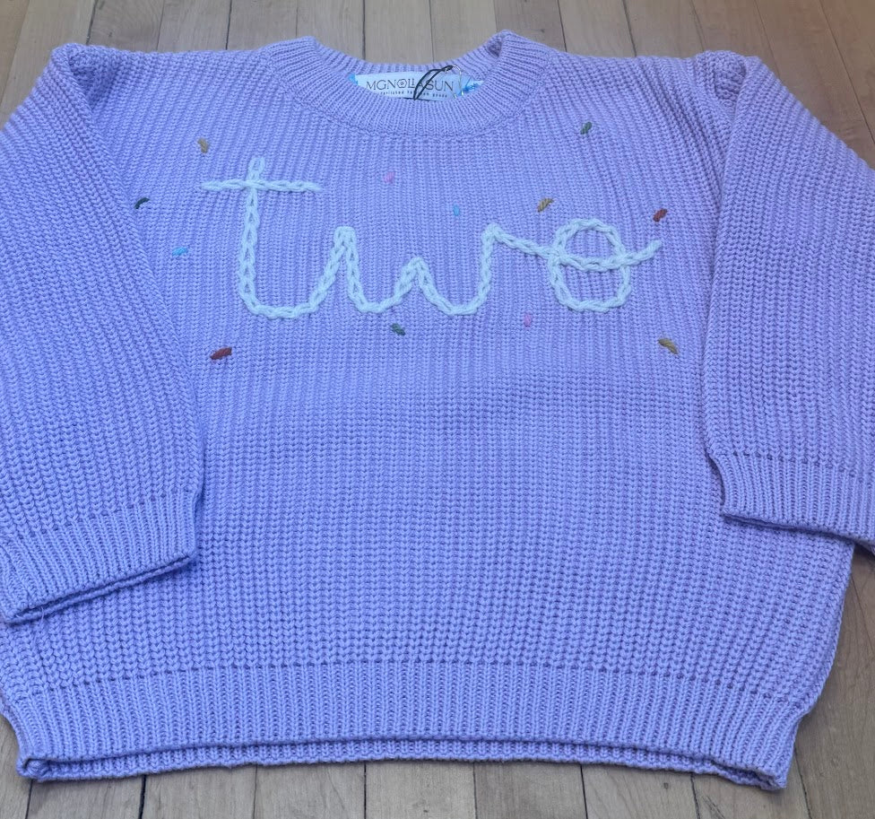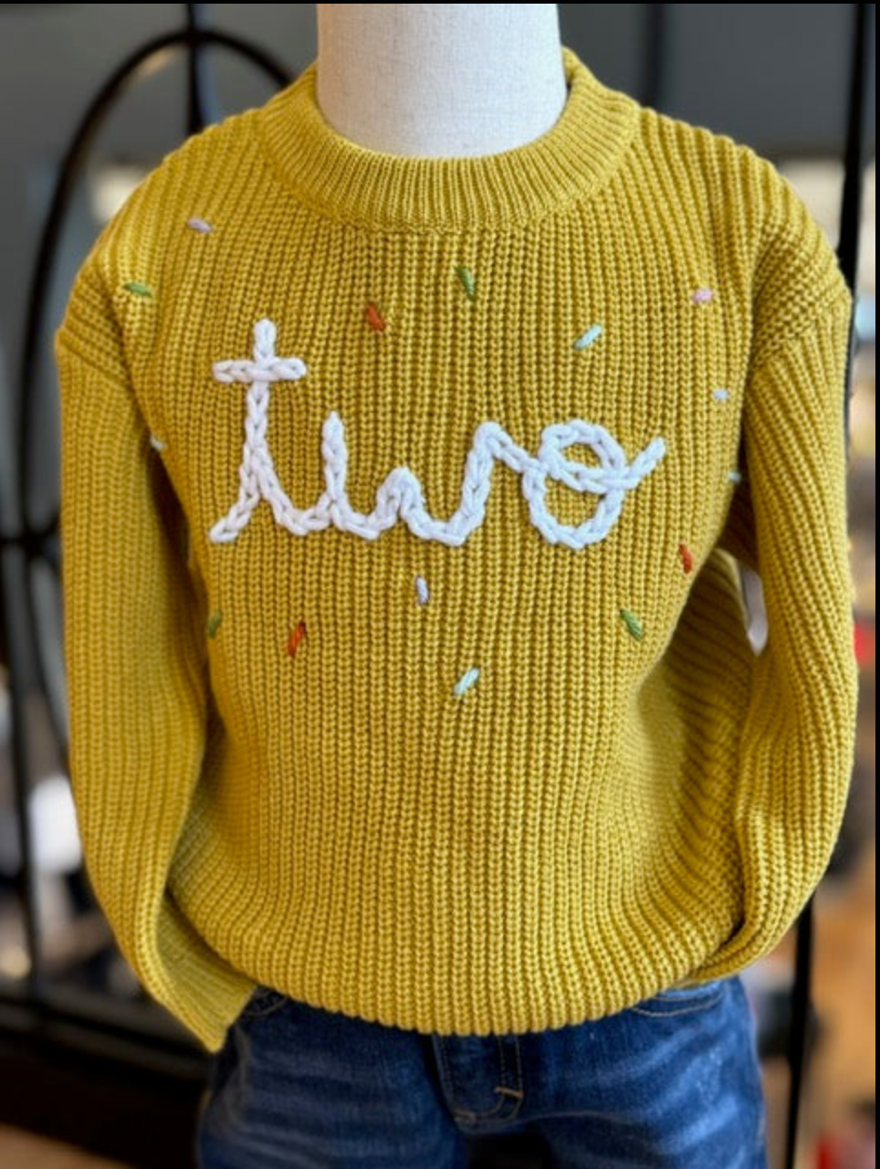This charming cotton sweater is hand-embroidered with a cheerful “TWO” and sprinkled with celebratory confetti, making it the perfect piece for birthday adventures, cake escapades, and memory making. Soft, cozy, and just the right amount of festive, it’s a magical way to mark a big milestone.