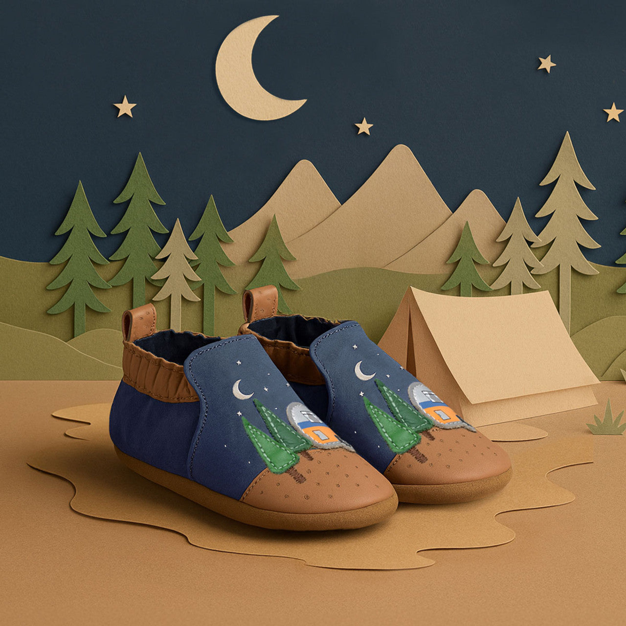 A starry night, a cozy camper, and baby’s very first adventures! The Under the Stars Soft Soles bring the magic of camping to your little one’s toes, with dreamy details like a crescent moon, twinkling stars, and evergreen trees 🌲🌟.