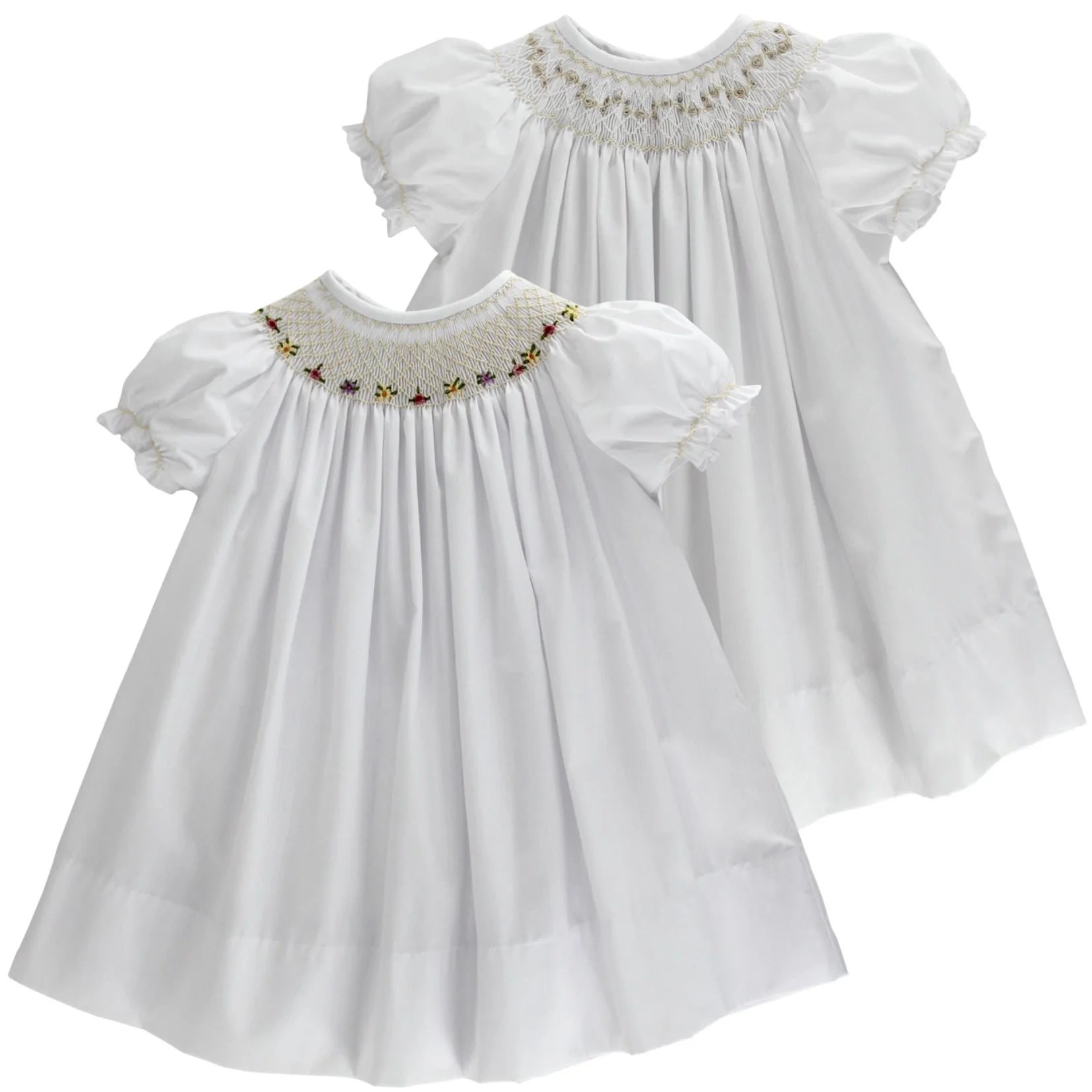 Graceful, classic, and sprinkled with a touch of cheerful charm, this bishop dress from the Bailey Boys Ceremony Collection is the epitome of heirloom elegance. Crafted in soft white cotton, the dress showcases exquisite hand-smocked embroidery along the neckline—delicate geometrics stitched in warm ecru and playful multi-color tones that add a whisper of festivity.