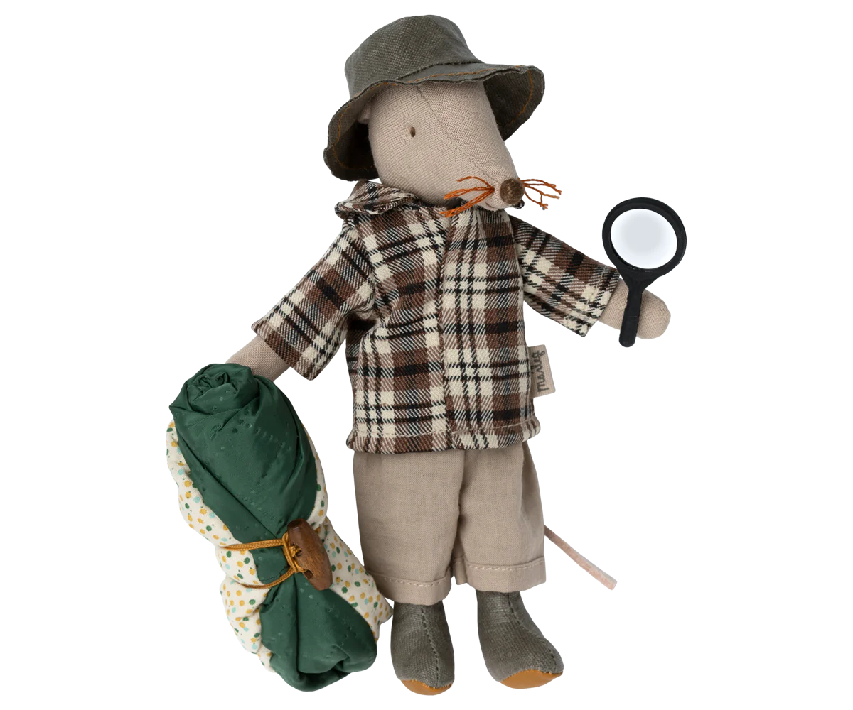 This wildlife guide mouse is ready for a hiking trip. The guide is dressed for walking and brings a sleeping bag and a magnifying glass to explore nature. This style is dad/mum size and has magnets in the hands.