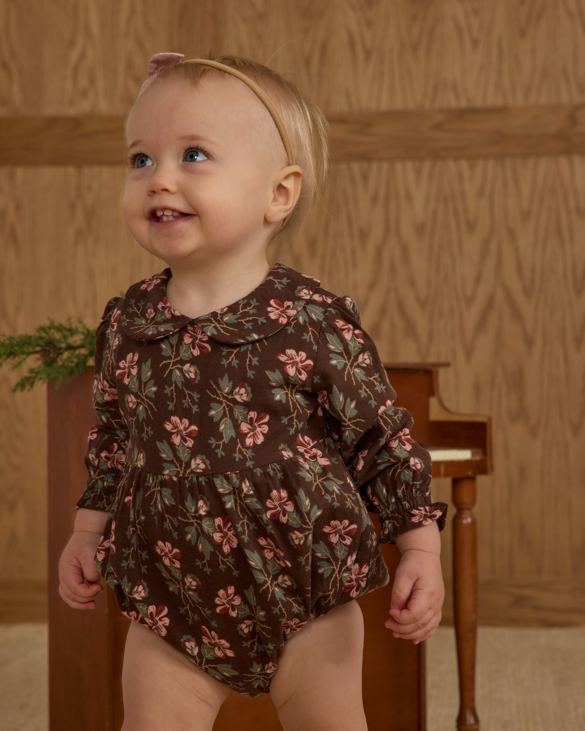 The Winter Floral Cora Romper is a cozy little treasure for the tiniest wardrobes. Made in a rich chocolate brown sprinkled with soft rose and sage blossoms, it brings a touch of garden charm to even the chilliest days. With its peter pan collar, gently puffed sleeves, and gathered waist, this romper balances vintage sweetness with everyday comfort.
