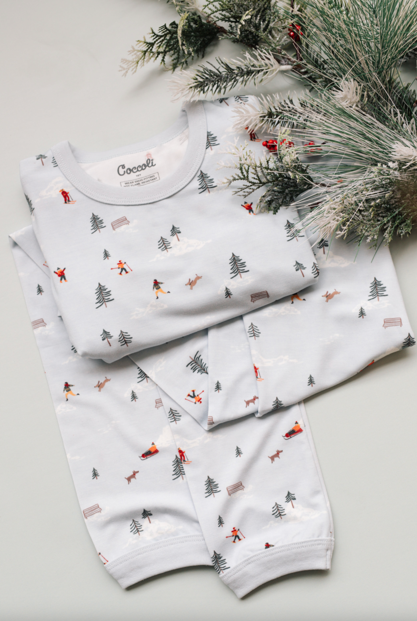 Stay warm and stylish with our Winter on Blue Pajama set. Made from soft blue fabric, this 2 piece set features a playful print of skiing, snow shoeing and other snow sports. Perfect for your little ones to snuggle in during the chilly season. #winterlove
